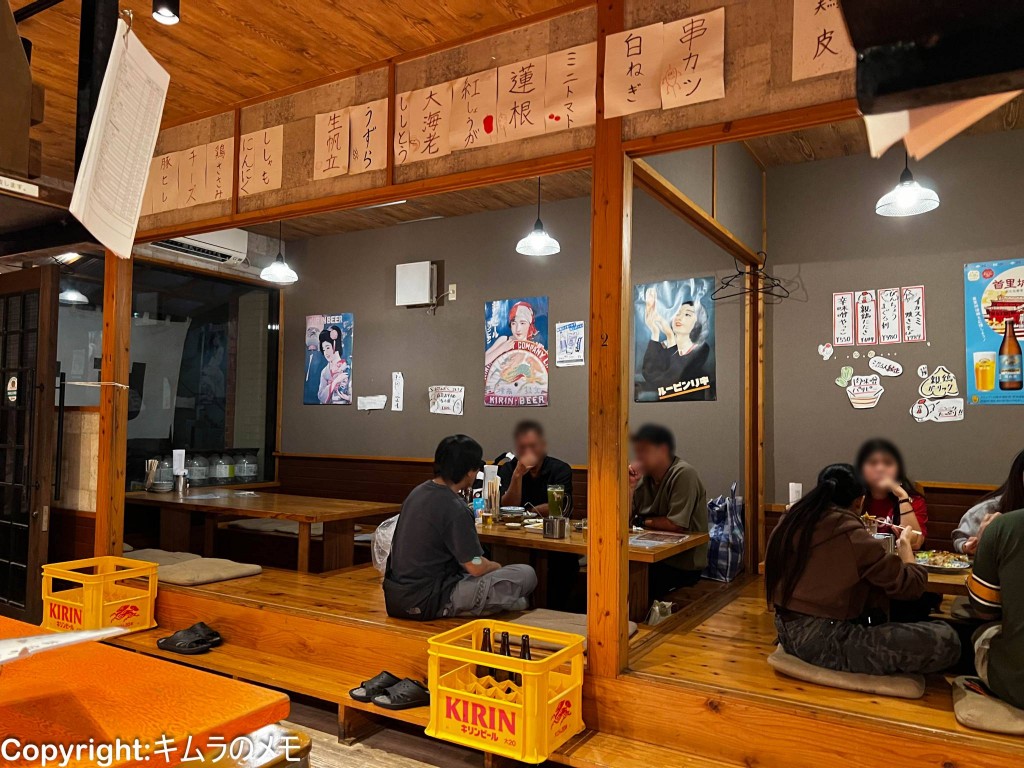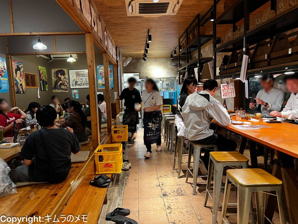 中央の通路を挟んで左側が4名掛けの掘りごたつが4卓、右側には10名掛けのテーブル席が2卓、トータルキャパは30名程度とそこまで大きくはない。