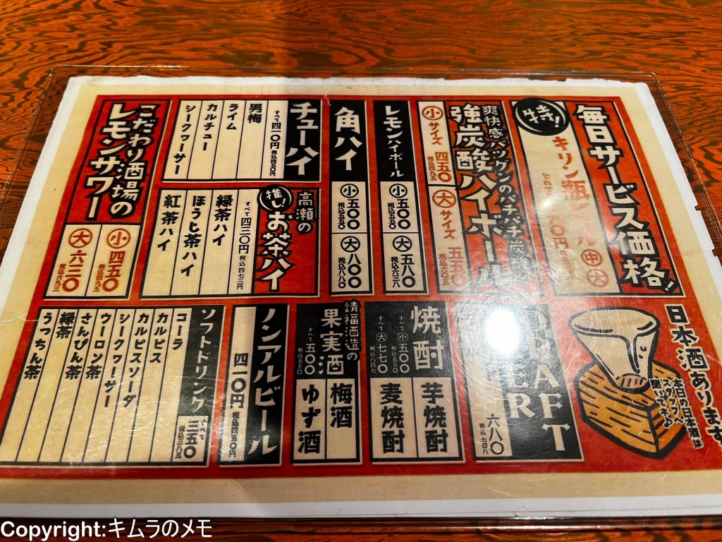 以前、香川県の高松でも同様のお店を利用したことがあり、明確には記載されていないのだが外観やメニュー、そして何より破格の瓶ビール価格設定から、同系列のお店と思われる。