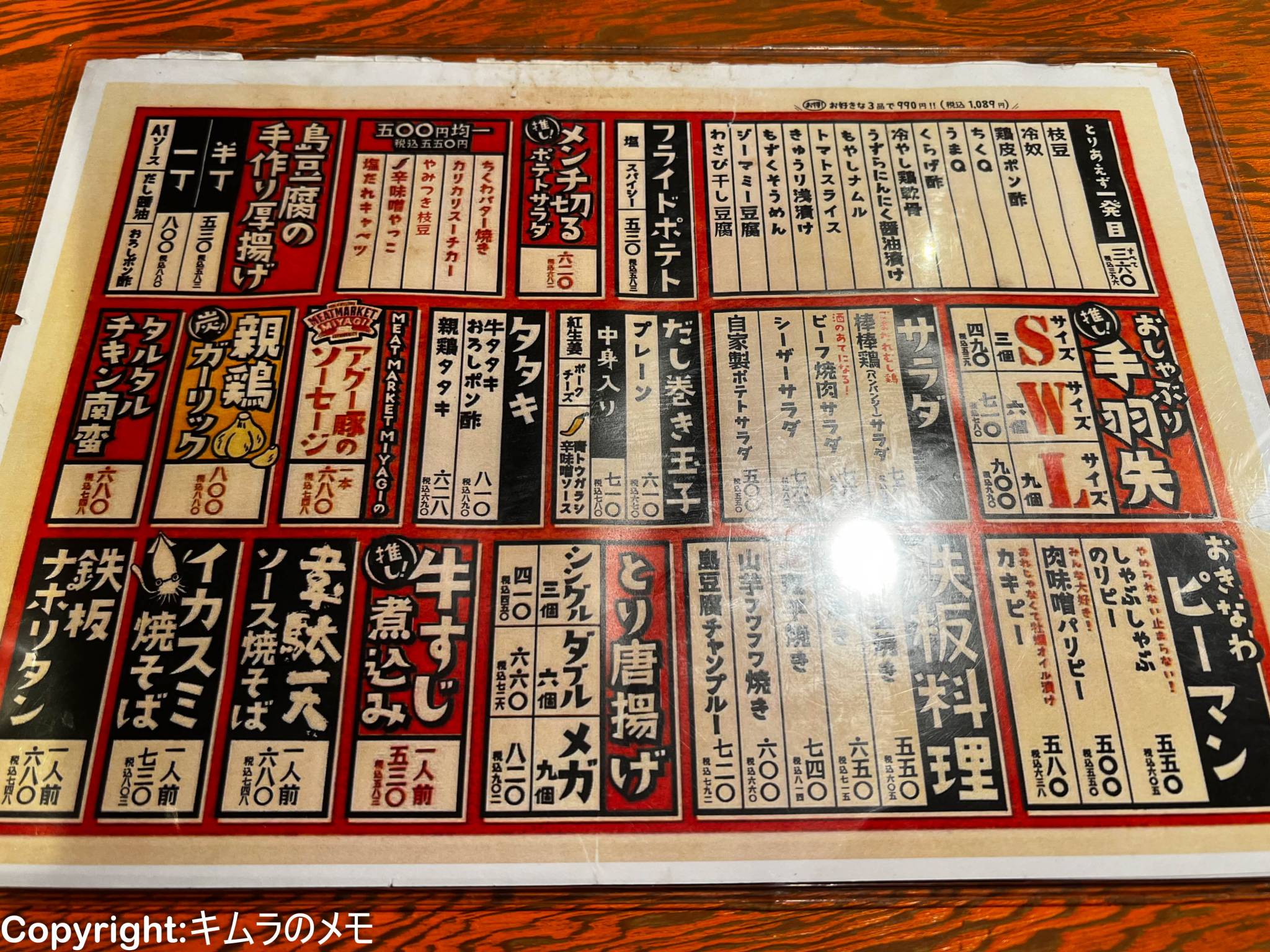 食べ物のメニューは典型的な居酒屋メニューとなっており、酒のつまみ系や揚げ物、炭水化物などが一通り揃っている。