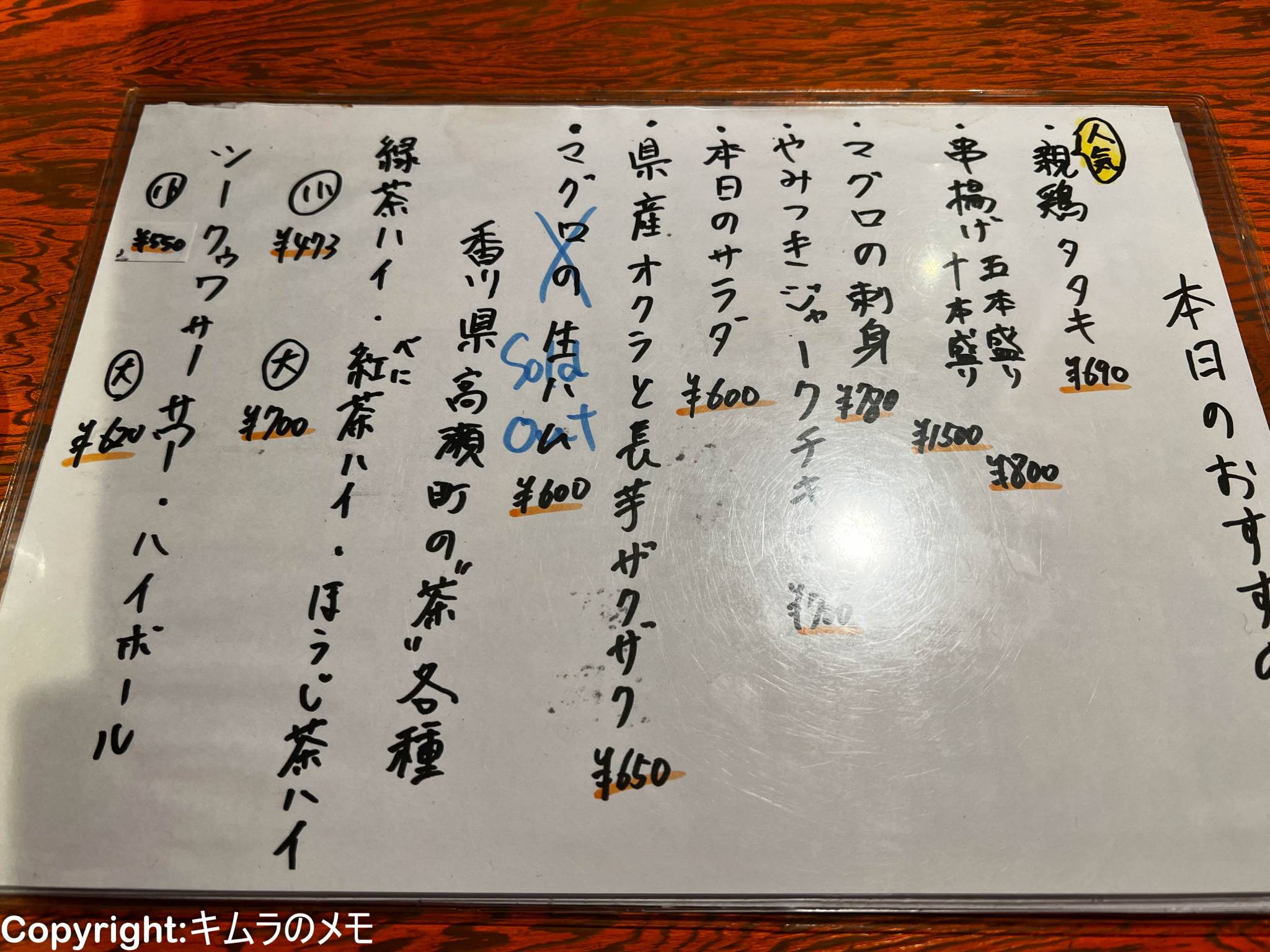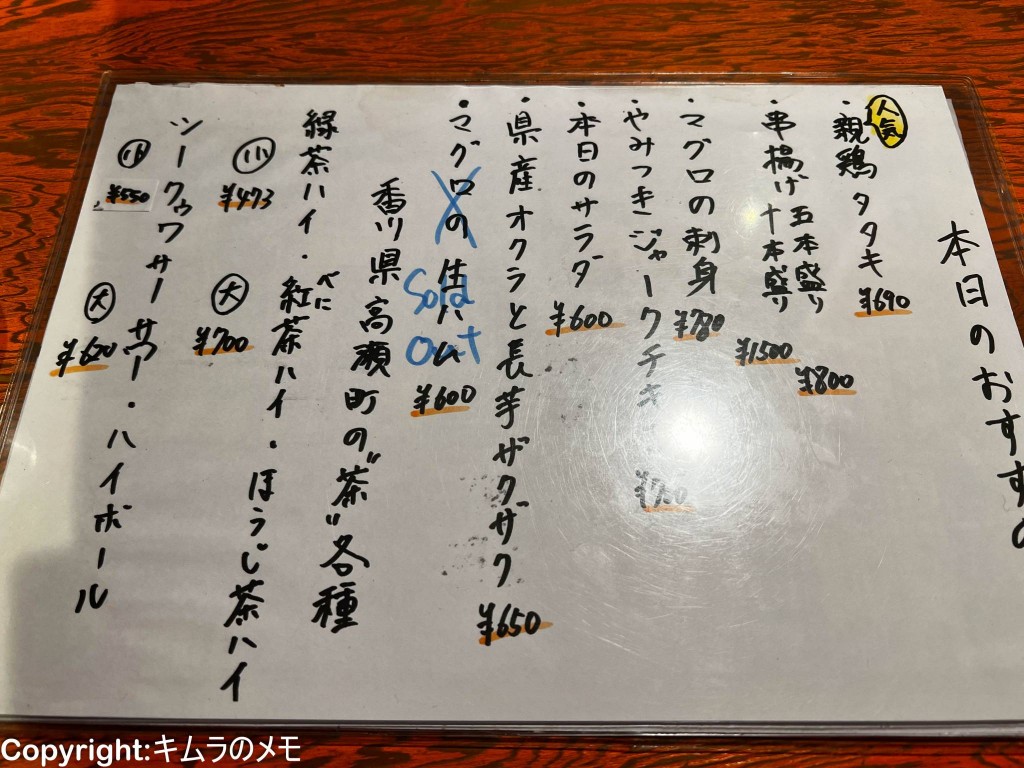 こちらは本日のオススメメニュー。