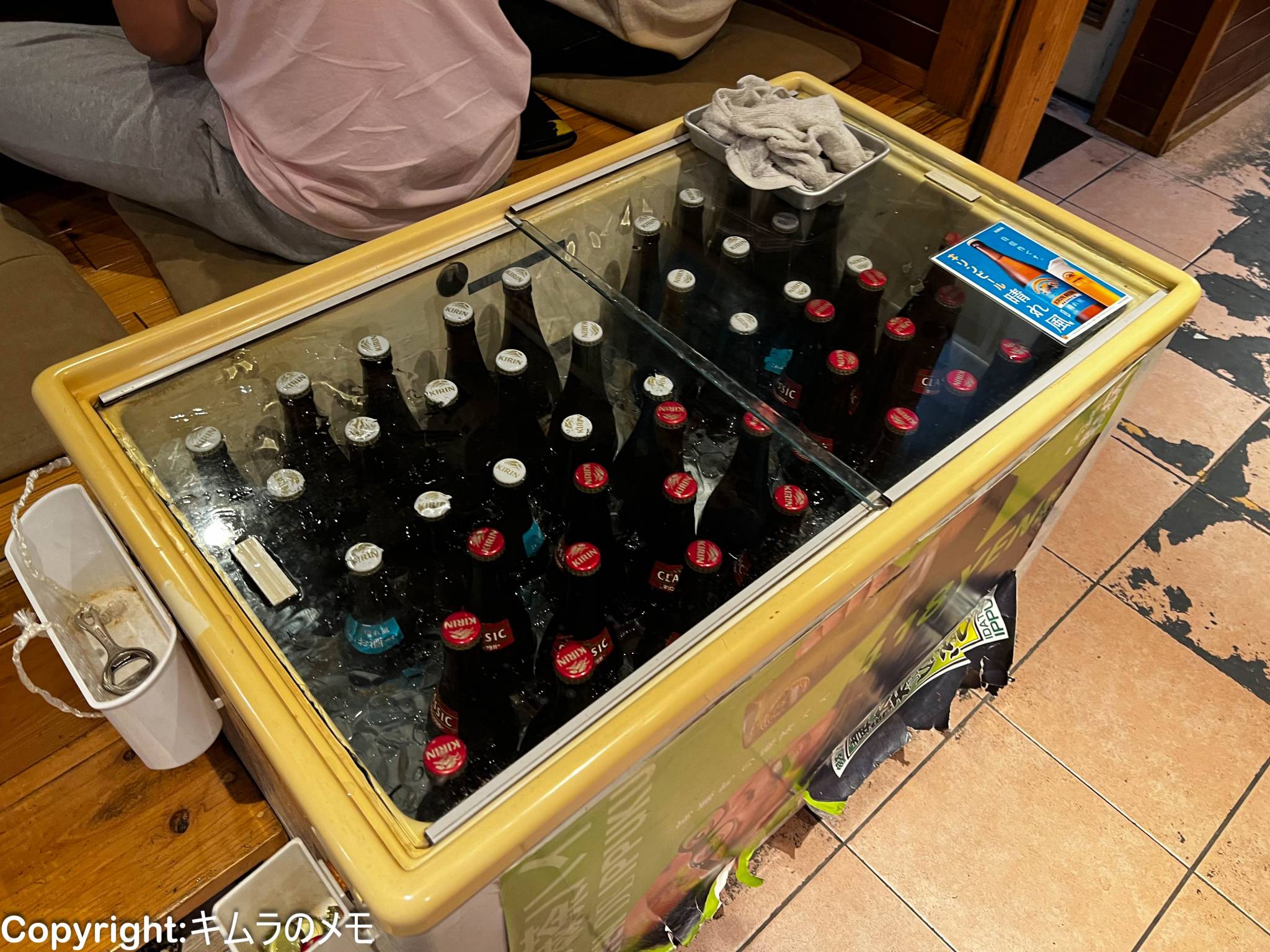 なお、ビンビールはセルフサービスで冷蔵庫から持ってくる方式で、大瓶も中瓶も同じ価格という不思議な価格設定になっている。