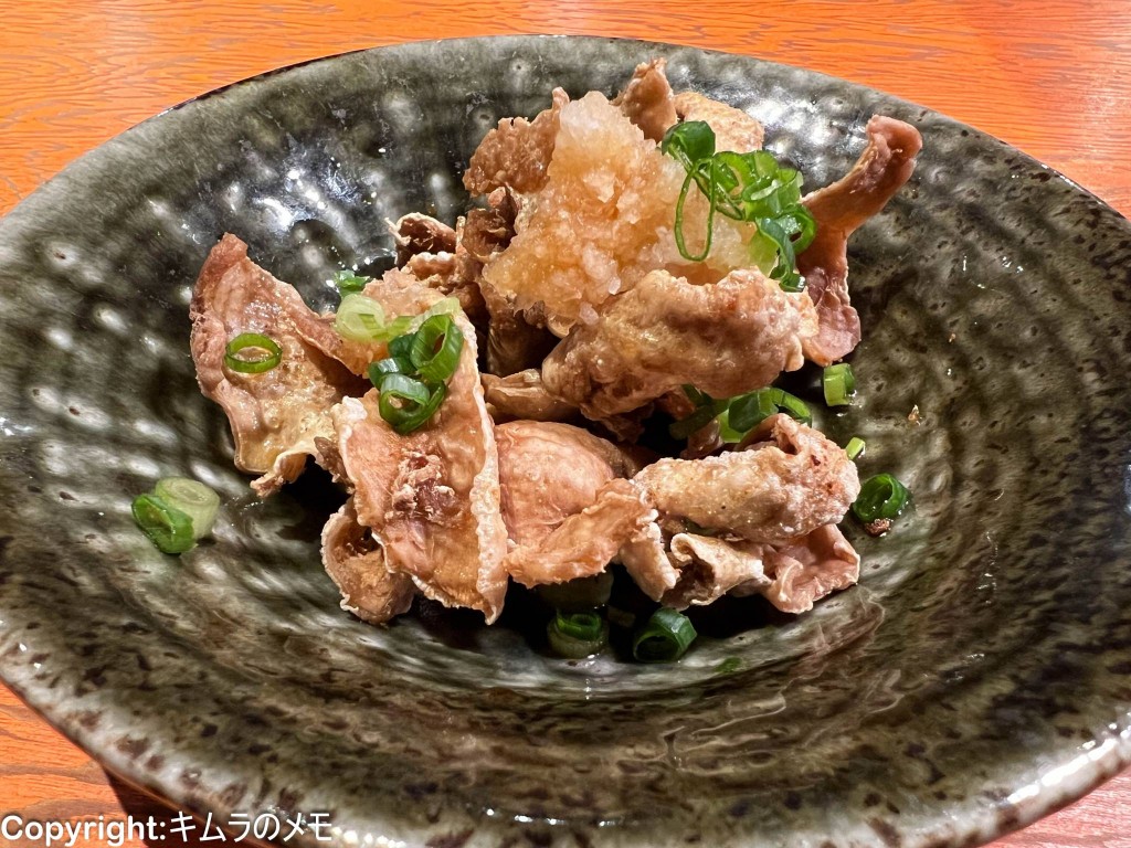 柔らかい鶏皮にたっぷりと大根おろしが添えられ、しっかりとポン酢の味わいが染み込んだものを想像してるとちょっとイメージはズレるが、これはこれで美味しくビールのつまみに最適。