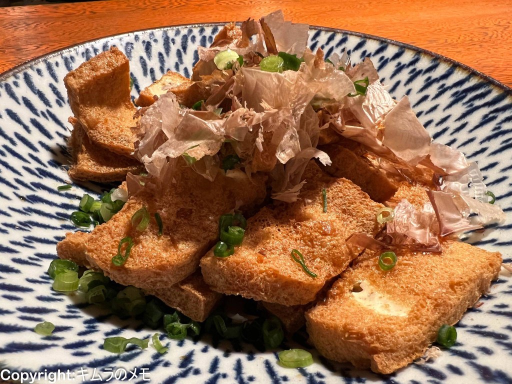 薄くスライスされた豆腐をカリカリに揚げてあり、そこに出汁の風味がしっかりと染み込んでおり濃厚な味わいになっている。