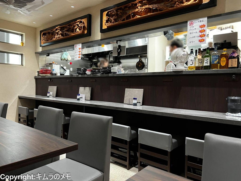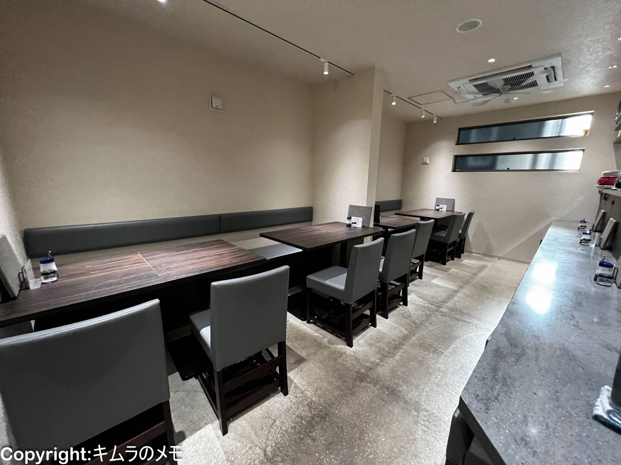 カウンター席が6席、4名掛けテーブルが3卓、2名掛けテーブルが1卓とトータルキャパは20席程度となっており、店舗の広さの割にはそこまで窮屈な感じはない。
