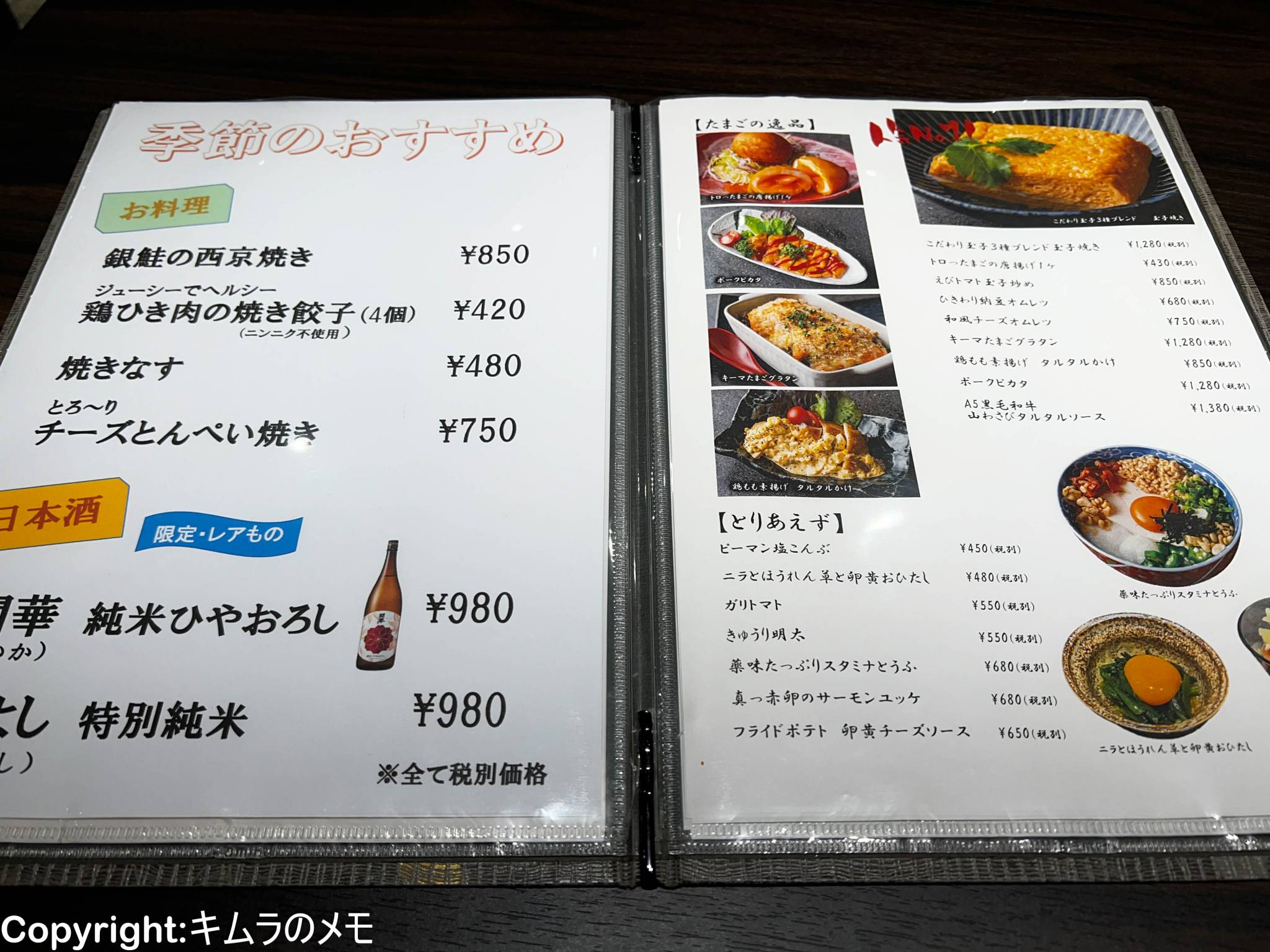玉子を使った料理が中心ではあるが、居酒屋らしいメニューも一通り揃っている。