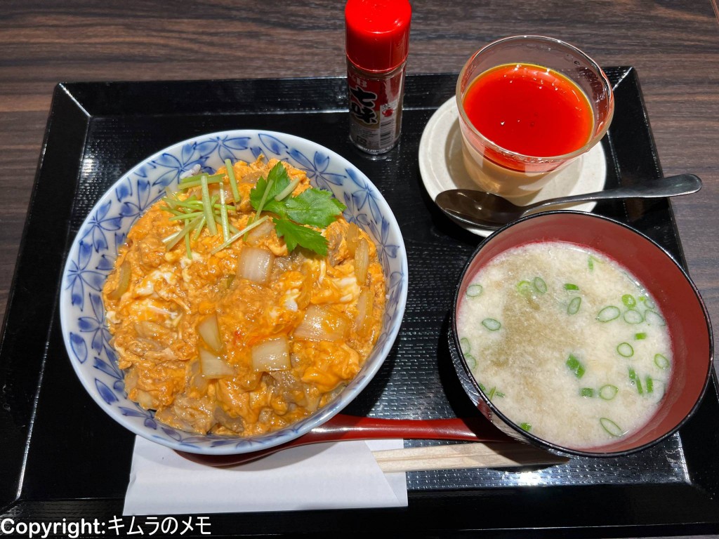 こちらのメニューはメインの親子丼の他に味噌汁とプリンがワンプレートで提供される。