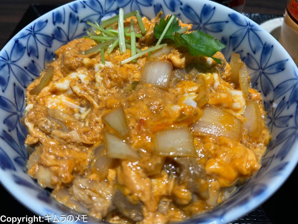 まずメインの親子丼から一口頂くが、一口サイズに刻まれた鶏肉の濃厚なうまみが口の中に広がる。