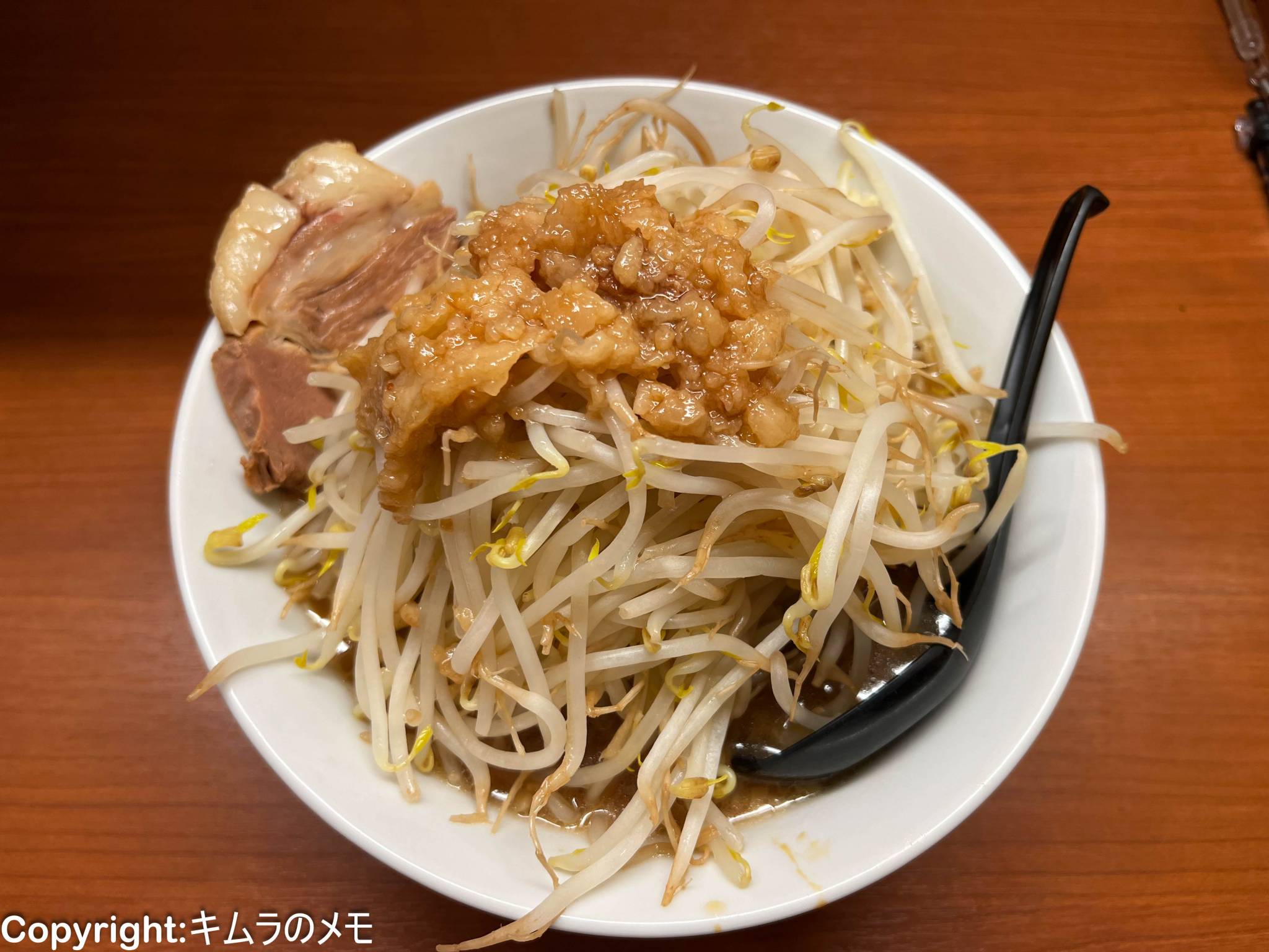 たっぷりと盛られたもやしの上にはアブラが鎮座。