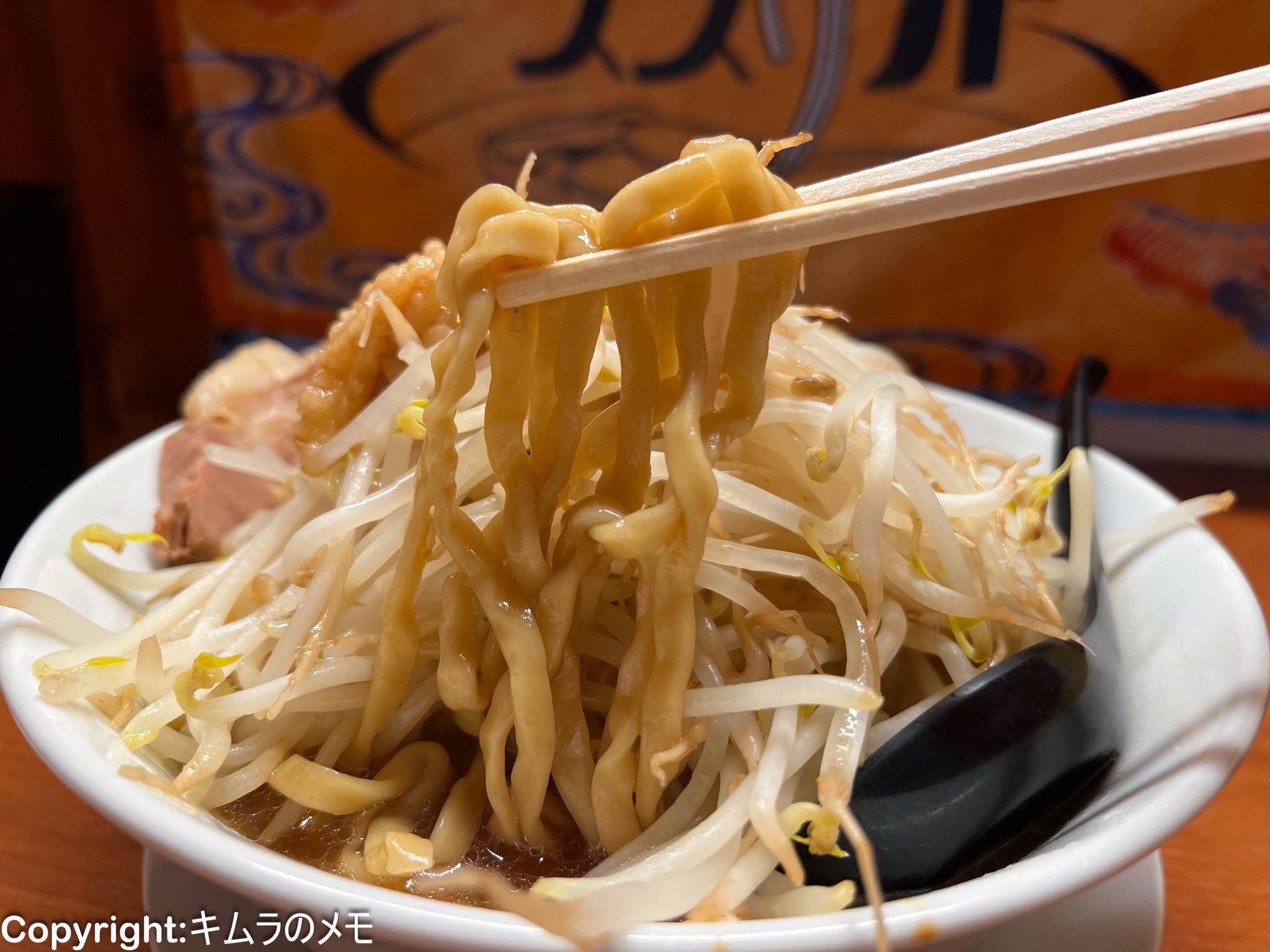 合わせる麺は平打ち縮れで薄めのきしめんタイプで二郎系のワシワシ感はそこそこあるのだが、麺そのものが薄めでモチモチ感もあり、がっつく感はそこまで無く食べやすい。