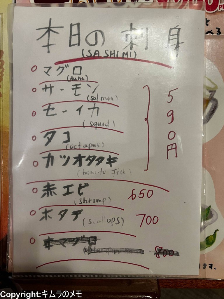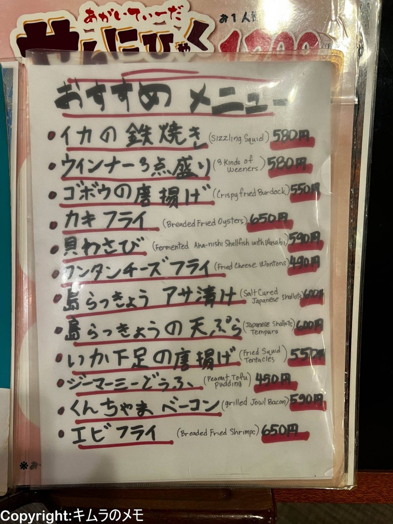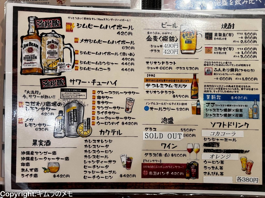 こちらのお店は居酒屋ということで、いわゆる居酒屋メニューを数多く取り揃えている。