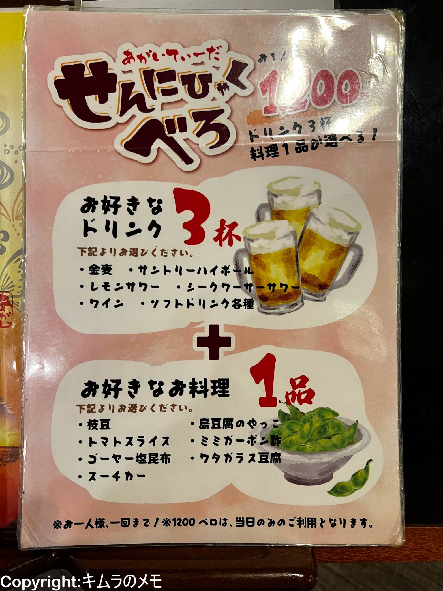 また、一人客にうれしいセンベロならぬ「せんにひゃくべろ」というメニューがあり、こちらは指定のドリンク3杯とおつまみを1品選んで1200円というコスパメニュー。
