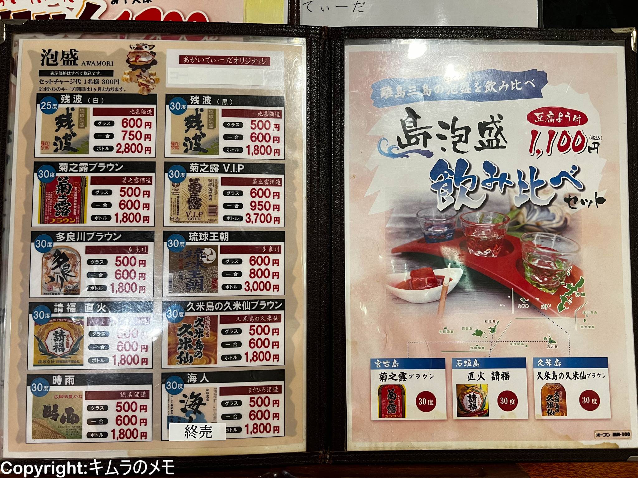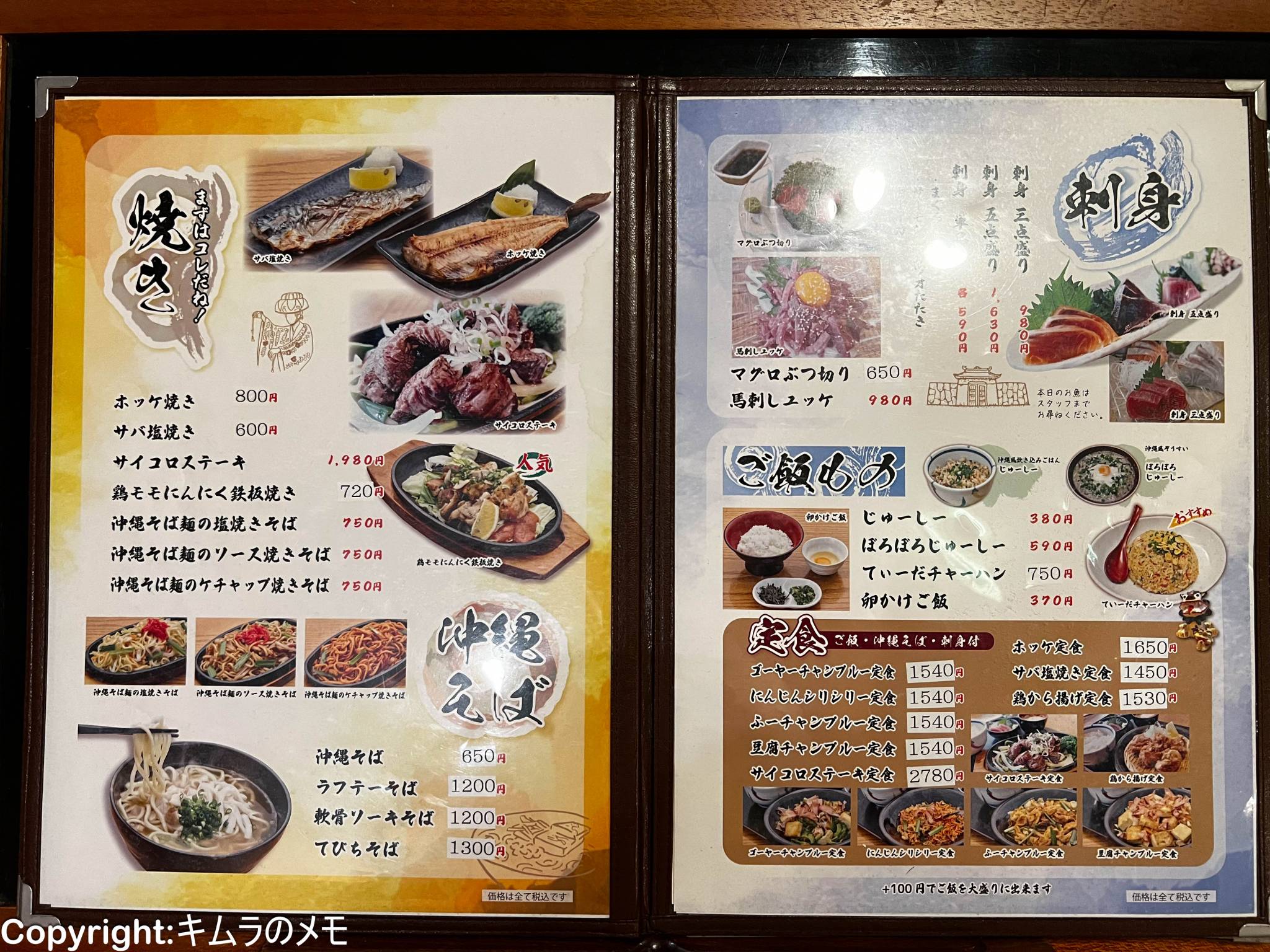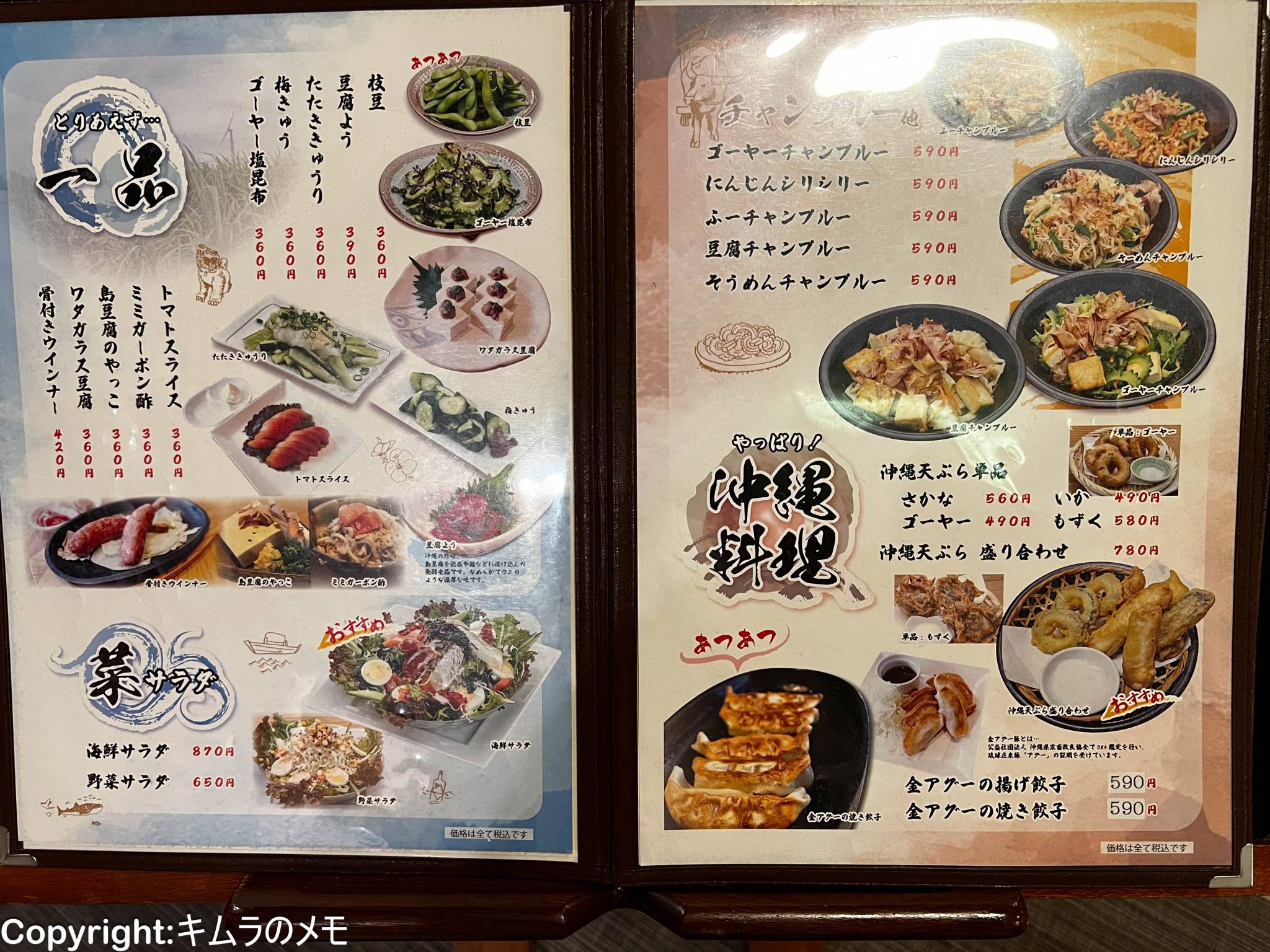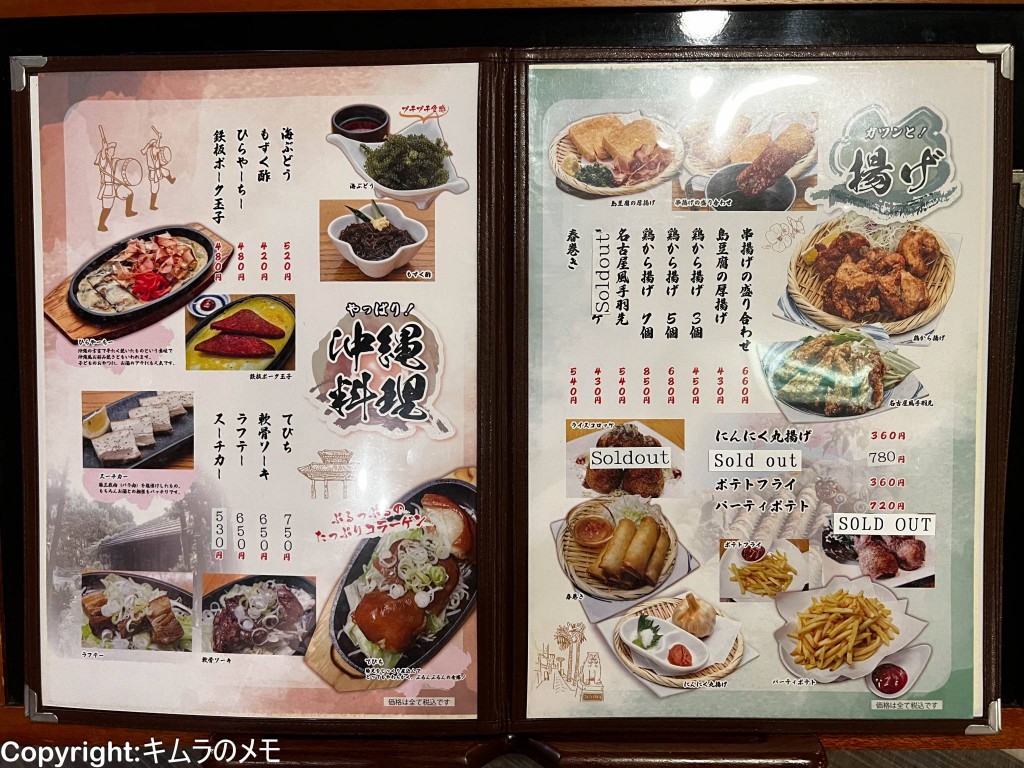居酒屋でよくみられるようなメニューを中心に、沖縄そばまで幅広く提供している。