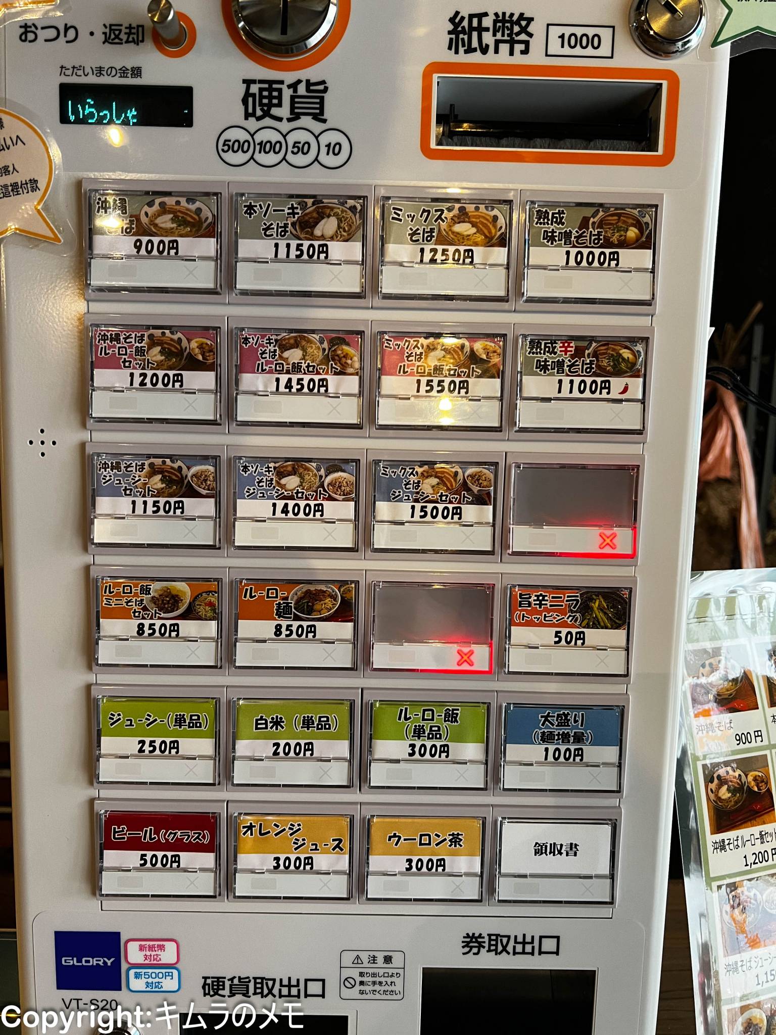メニューの数は一見すると多めに見えるのだが、基本の沖縄そばにトッピングのソーキやサイドメニューのジューシーやルーローハンを追加されたセットメニューが多くあるので、メニューそのものだけを見ると沖縄そばに加えて味噌そば、辛味噌そばの3種類のみとなる。