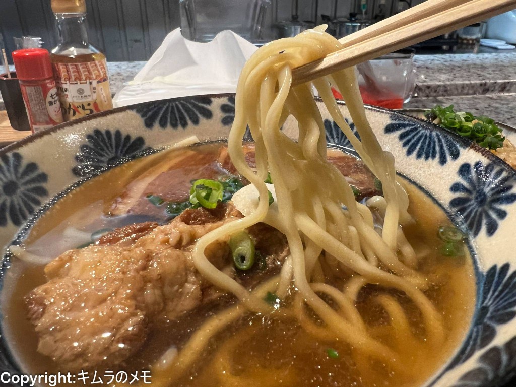 平打ちストレートのやや太め、ツルツルもちもち系で小麦粉感をしっかりと感じられるタイプでいわゆる沖縄そばの麺とは異なるもの。