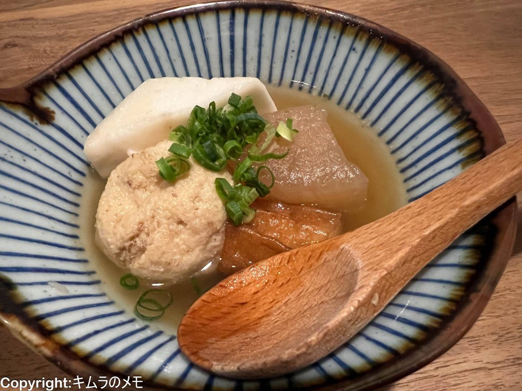 おでんということで、大根、はんぺん、ちくわ、がんもの4種類が小鉢も盛られて提供された。