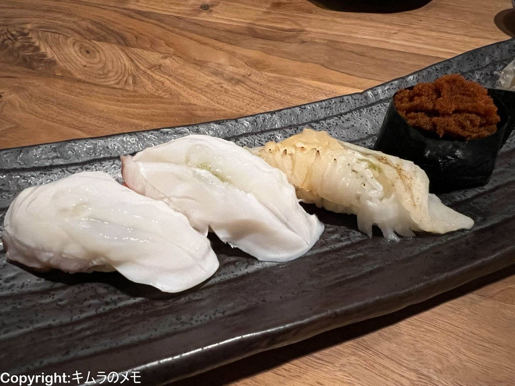 「柚子塩イカ」、「羅臼産 松川カレイ」、「紋別産ボタン海老 ミソ軍艦付き」をオーダーした。