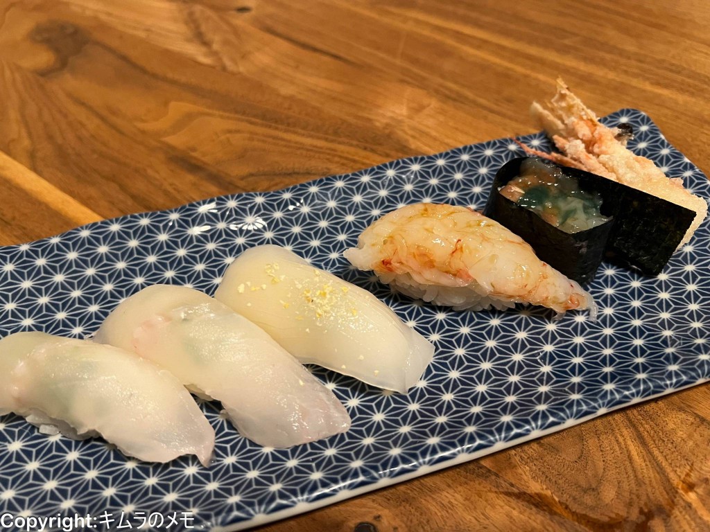 身の部分は握り、海老味噌は軍艦、そして頭は素揚げにしてあり、全てを美味しく楽しめるオススメの一品であった。