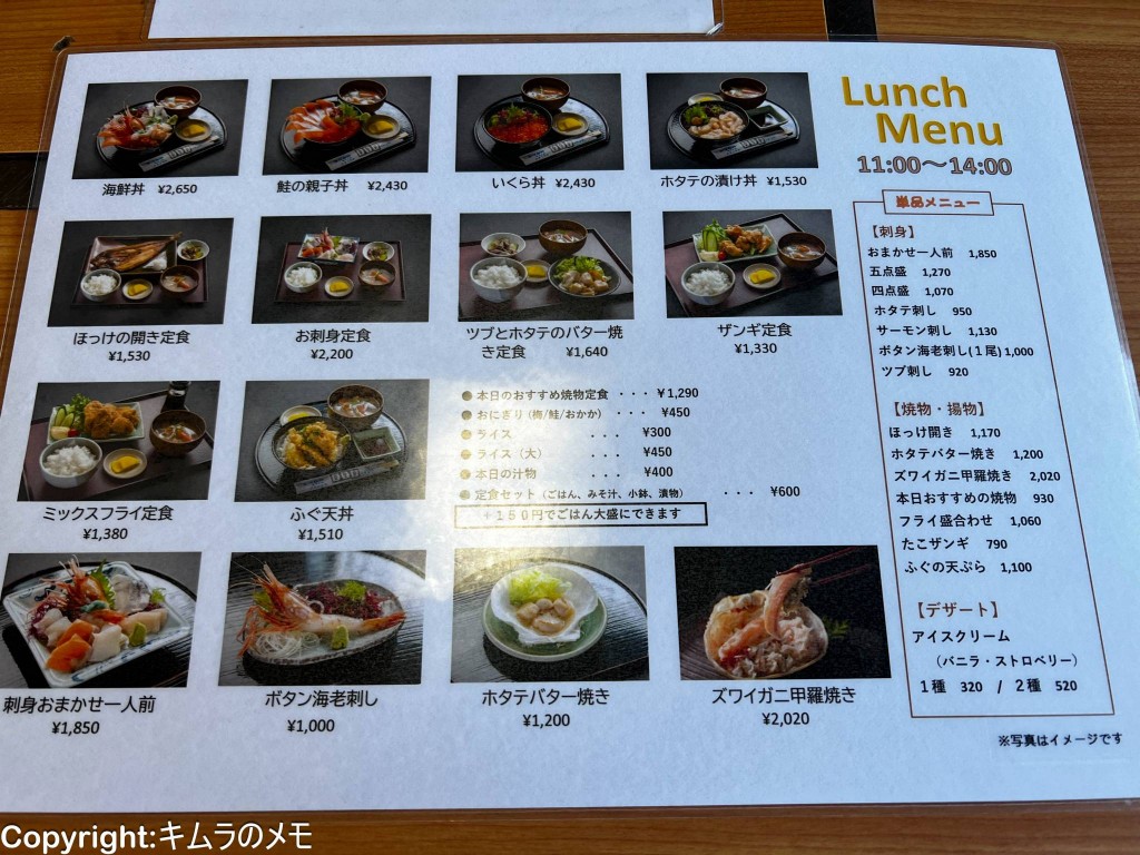 水産加工会社直営ということで魚介の鮮度や質は間違いないので、紋別に行った際には文字通り「よってけ」という感じのお店であった。