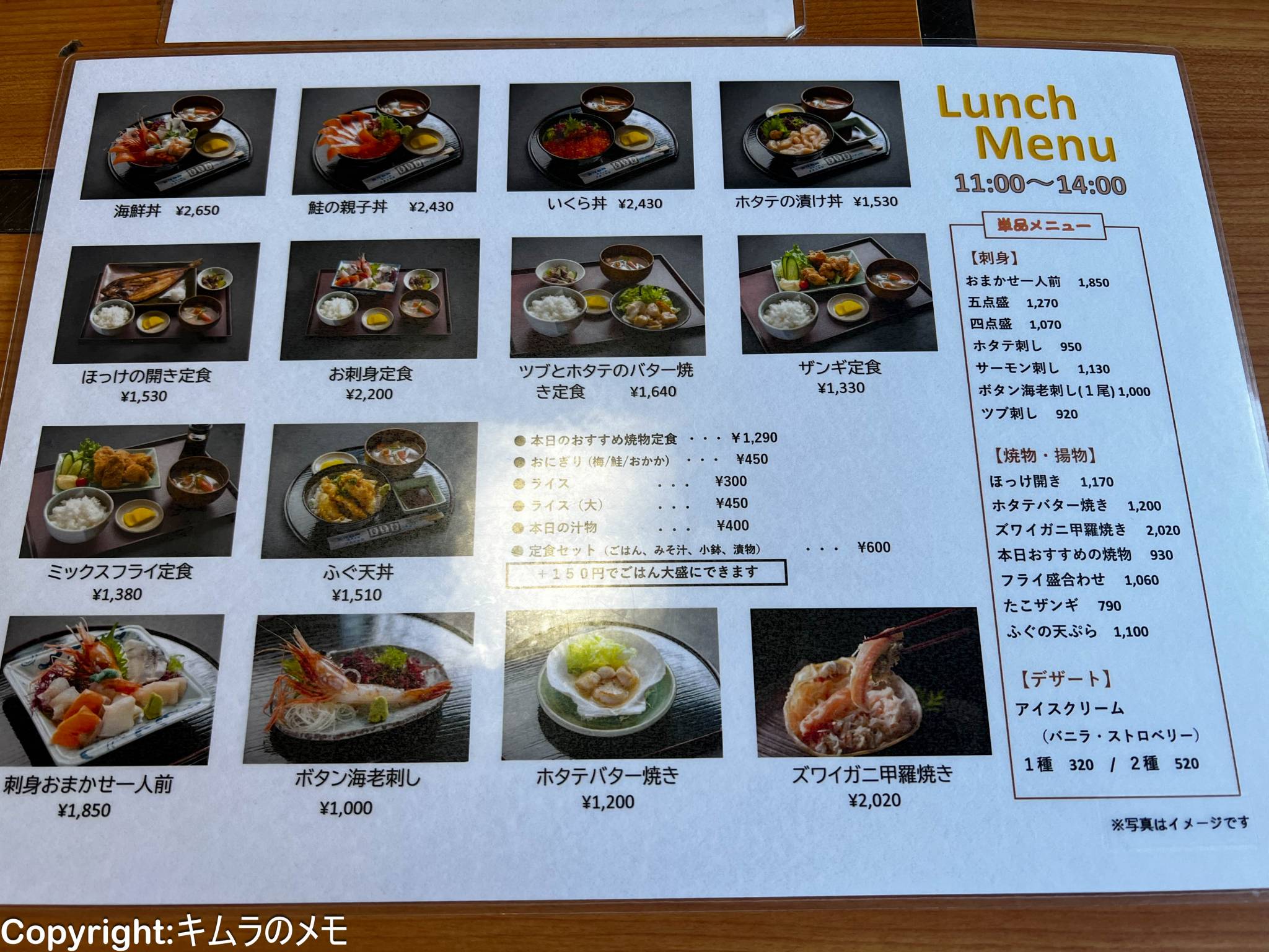 ランチメニューは定食、丼もの、焼き物など、海鮮系のお店で食べたいと思うメニューが一通り揃っている感じ。
