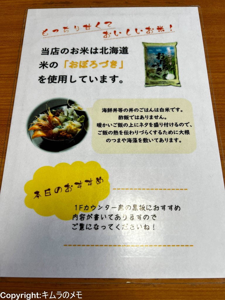 日替わりの焼魚や海鮮丼のネタなどが書かれている。