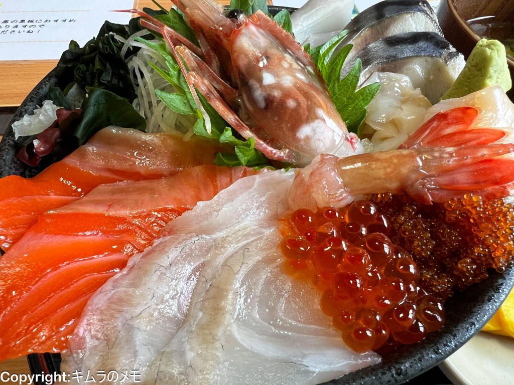 「海鮮丼」はボタンエビ、タコ、サーモン、ホタテ、鯛、しめ鯖、ツブ貝、とびっこ、いくらの9種類が贅沢に盛られており、いずれのネタも上質で美味しい。