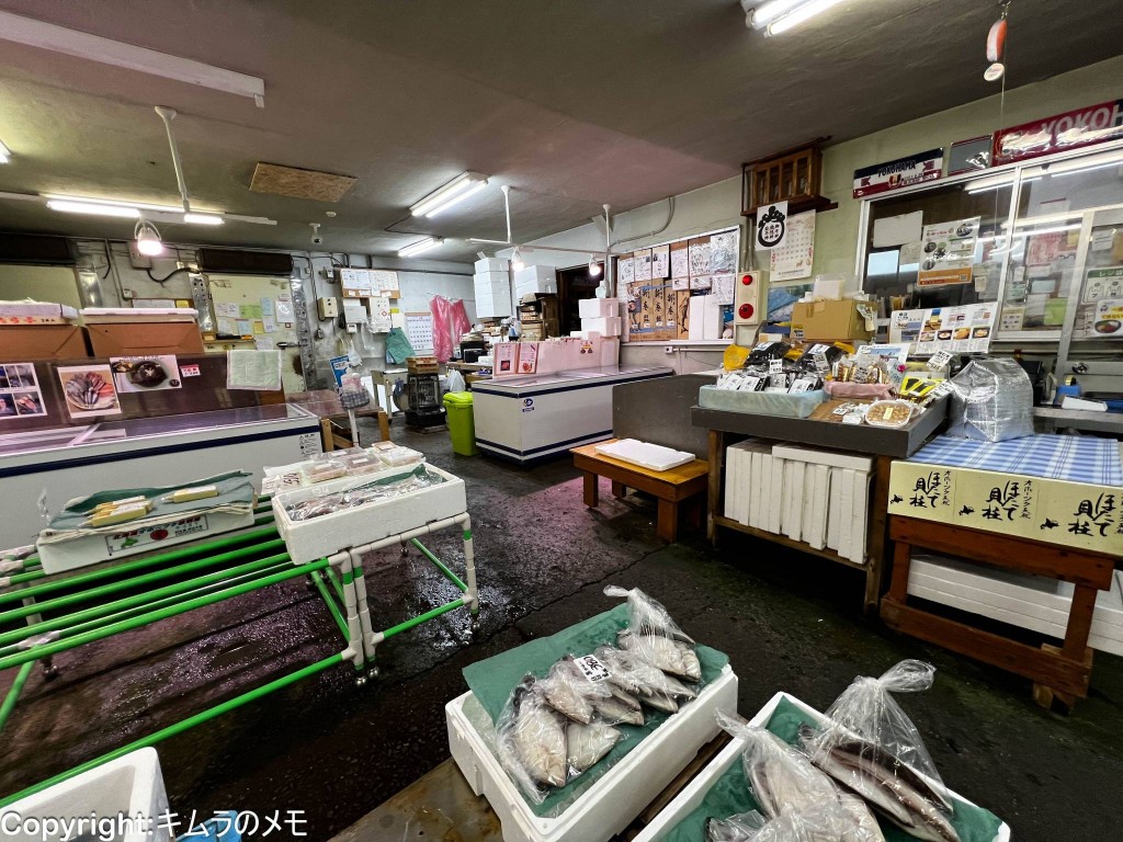 飲食店の建物は海産物直売所に併設されており、写真左側は海産物直売所への入り口。
