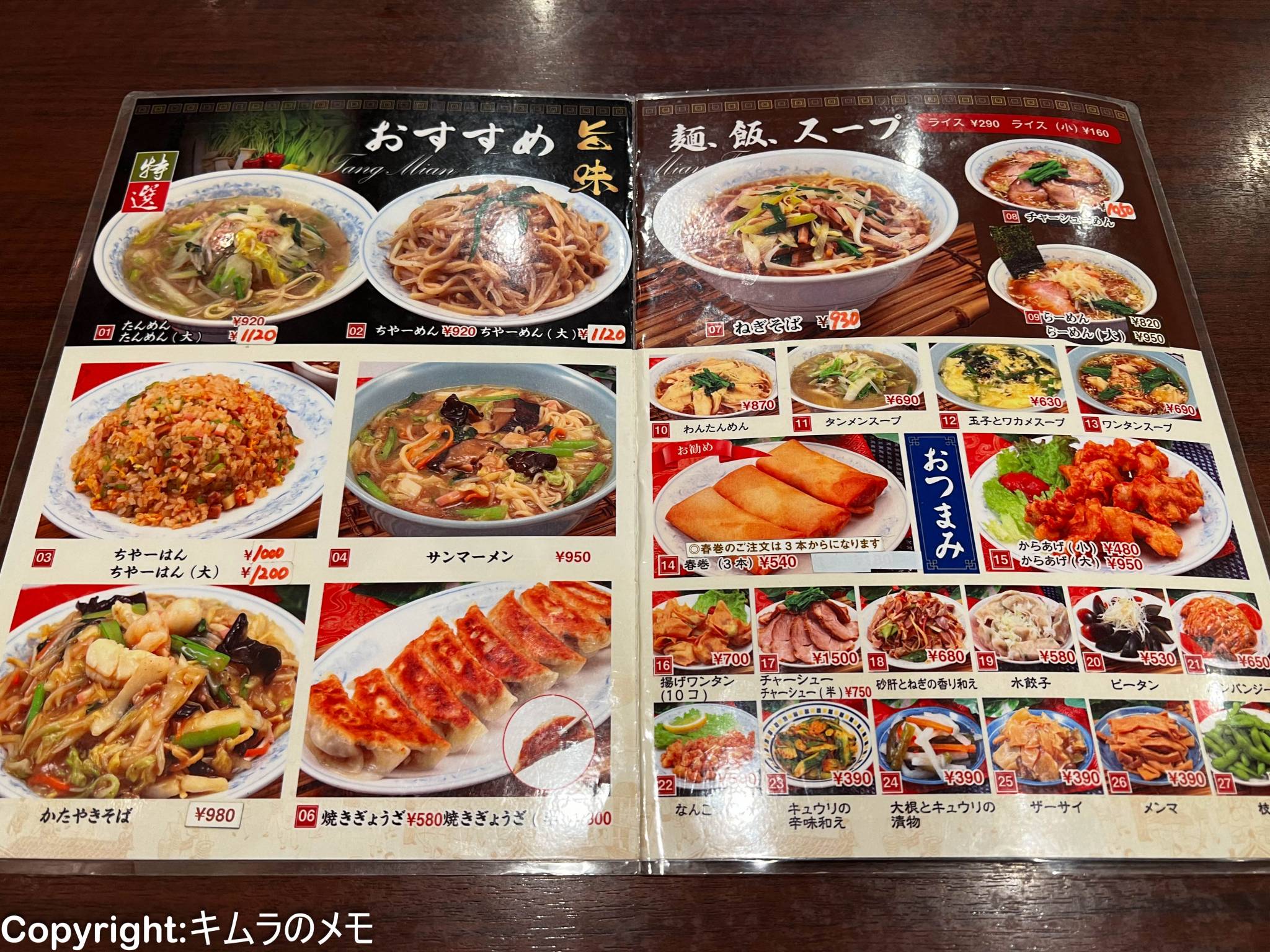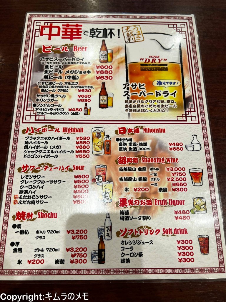 こちらの店は中華料理店ということで、麺ものからご飯系、スープ類や餃子など一通りの中華メニューが揃っているという印象。