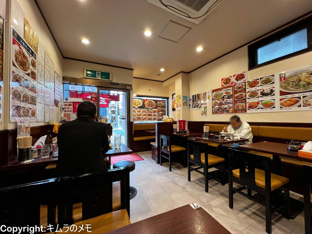 店内はいわゆる町中華的な雰囲気となっており、4名掛けテーブルが5卓、2名掛けテーブルが2卓、そして6名で使えるテーブルが1卓の、トータルキャパは30名程度。
