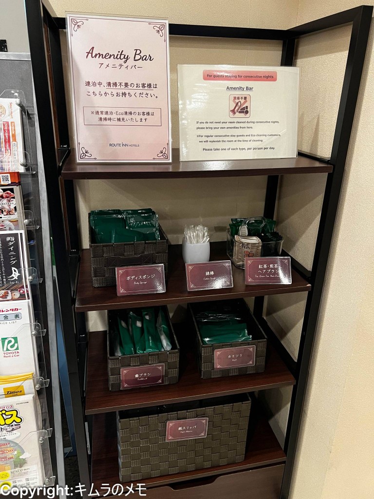 連泊かつ清掃不要とした場合には、フロントにあるアメニティーコーナーから必要なものを追加で利用することが可能。