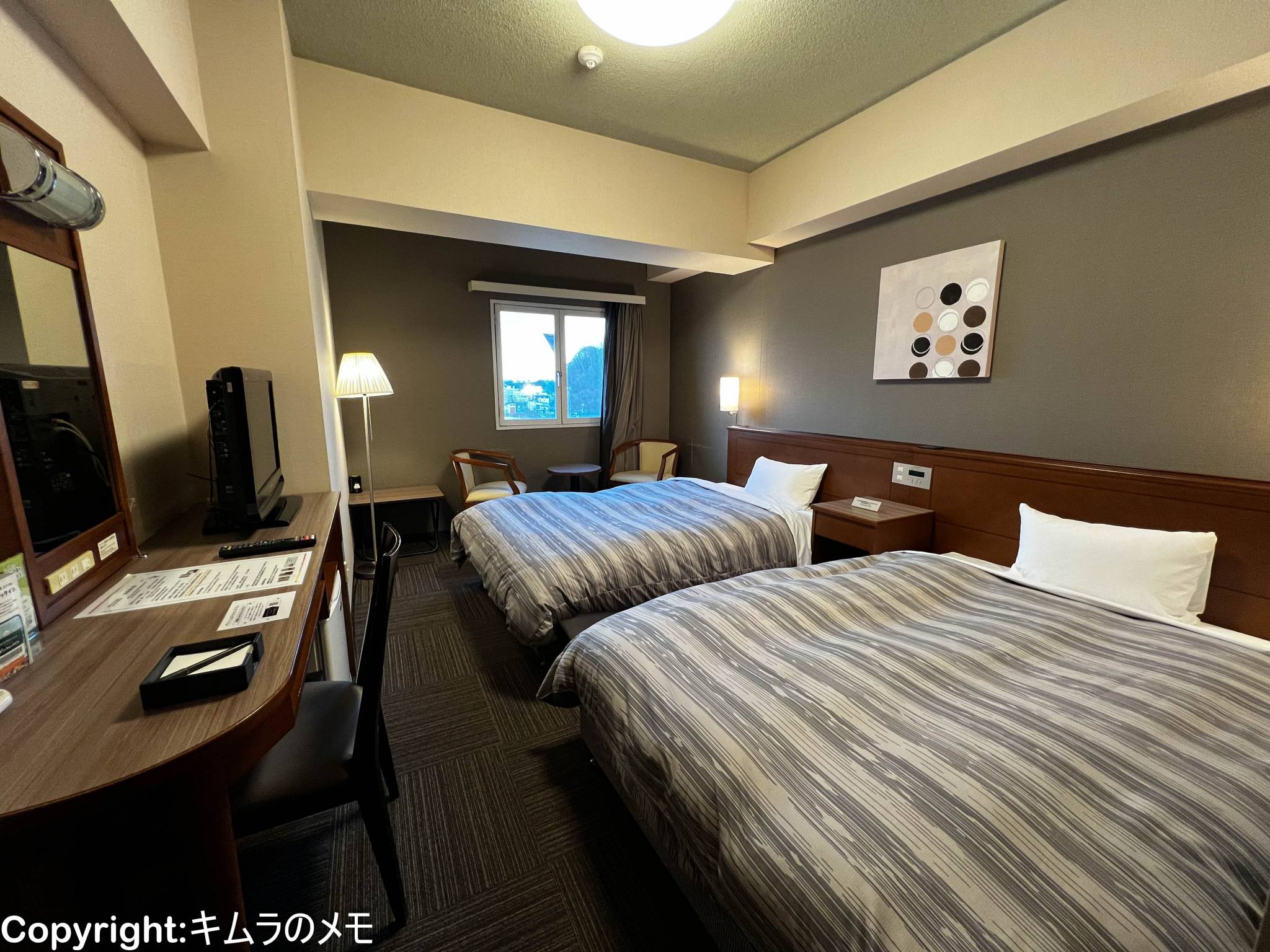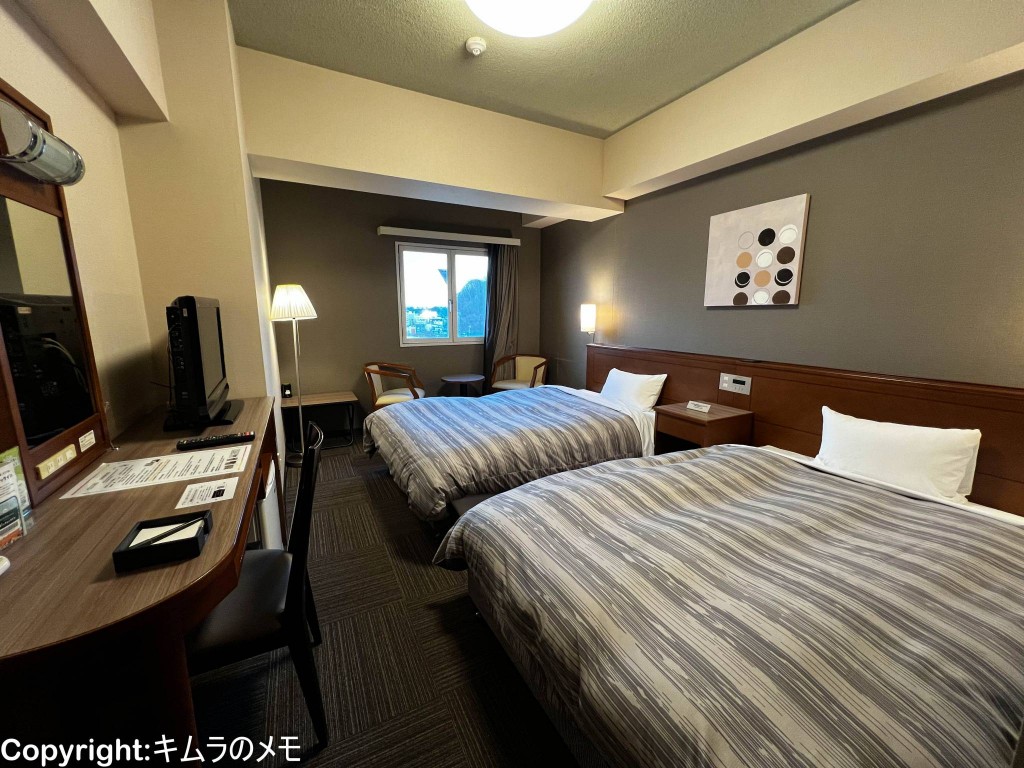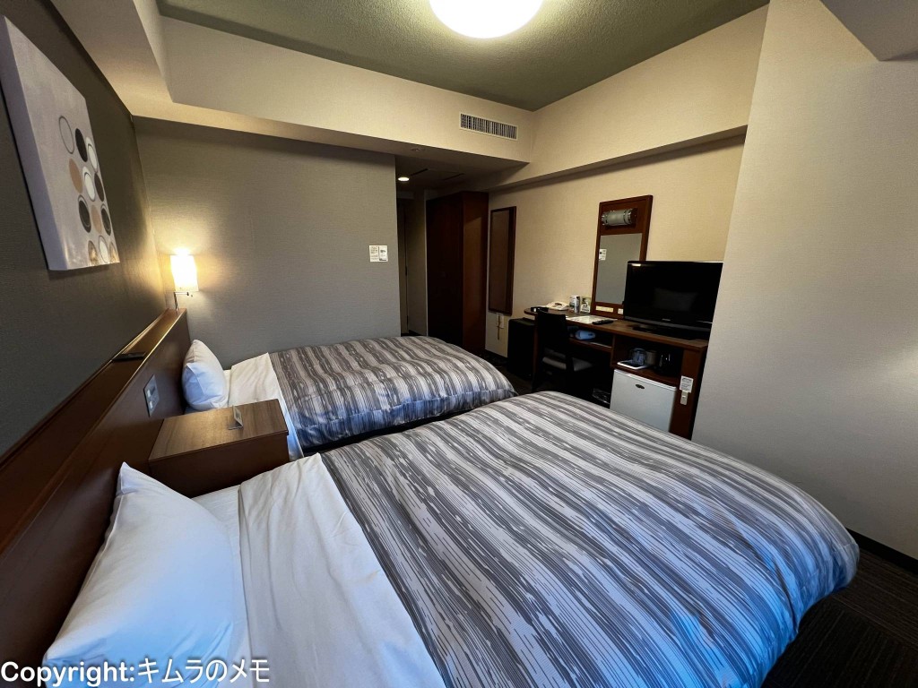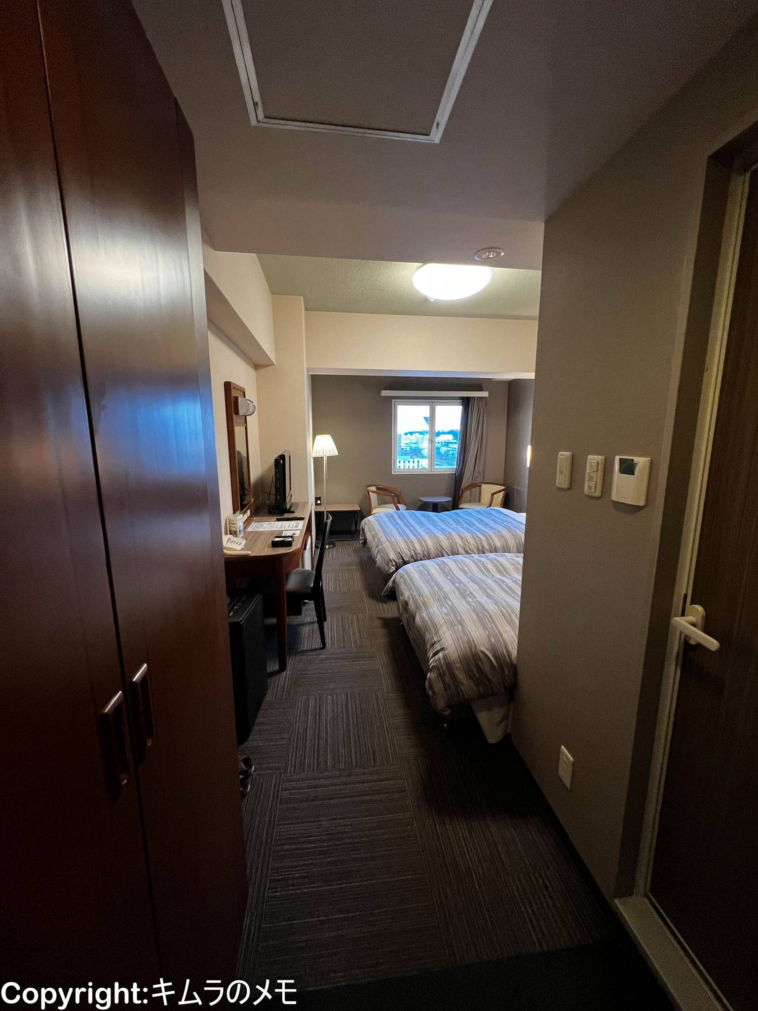 客室そのものは18平米とビジネスホテルにしては少し広めということもあり、120センチのベッドが2台入ってもそこまで窮屈感はない。