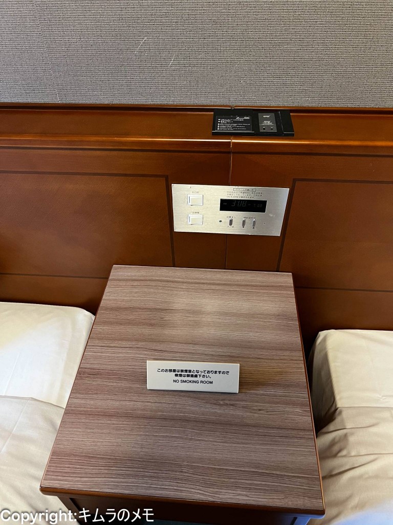 今回はツインの客室ということもあり、ベッドの間のテーブルに客室の照明を調整するスイッチや、スマホを充電できるコンセントとUSB充電口が2口用意されている。