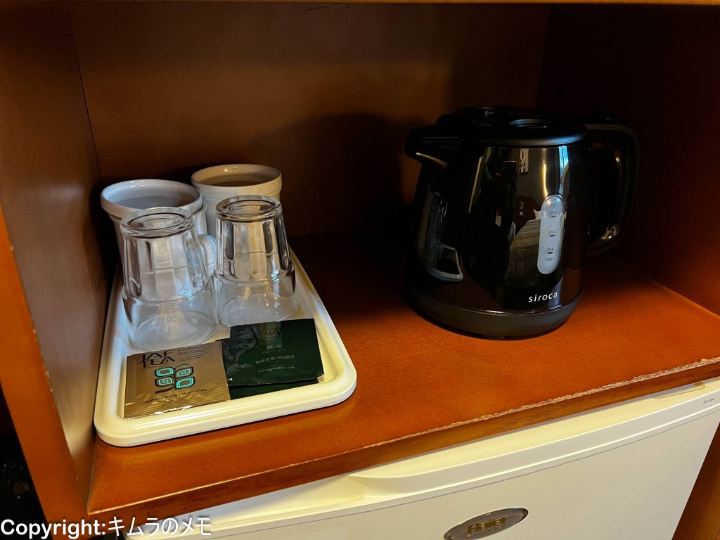 なお、こちらのテーブルの下には冷蔵庫と無料のお茶が用意されている。