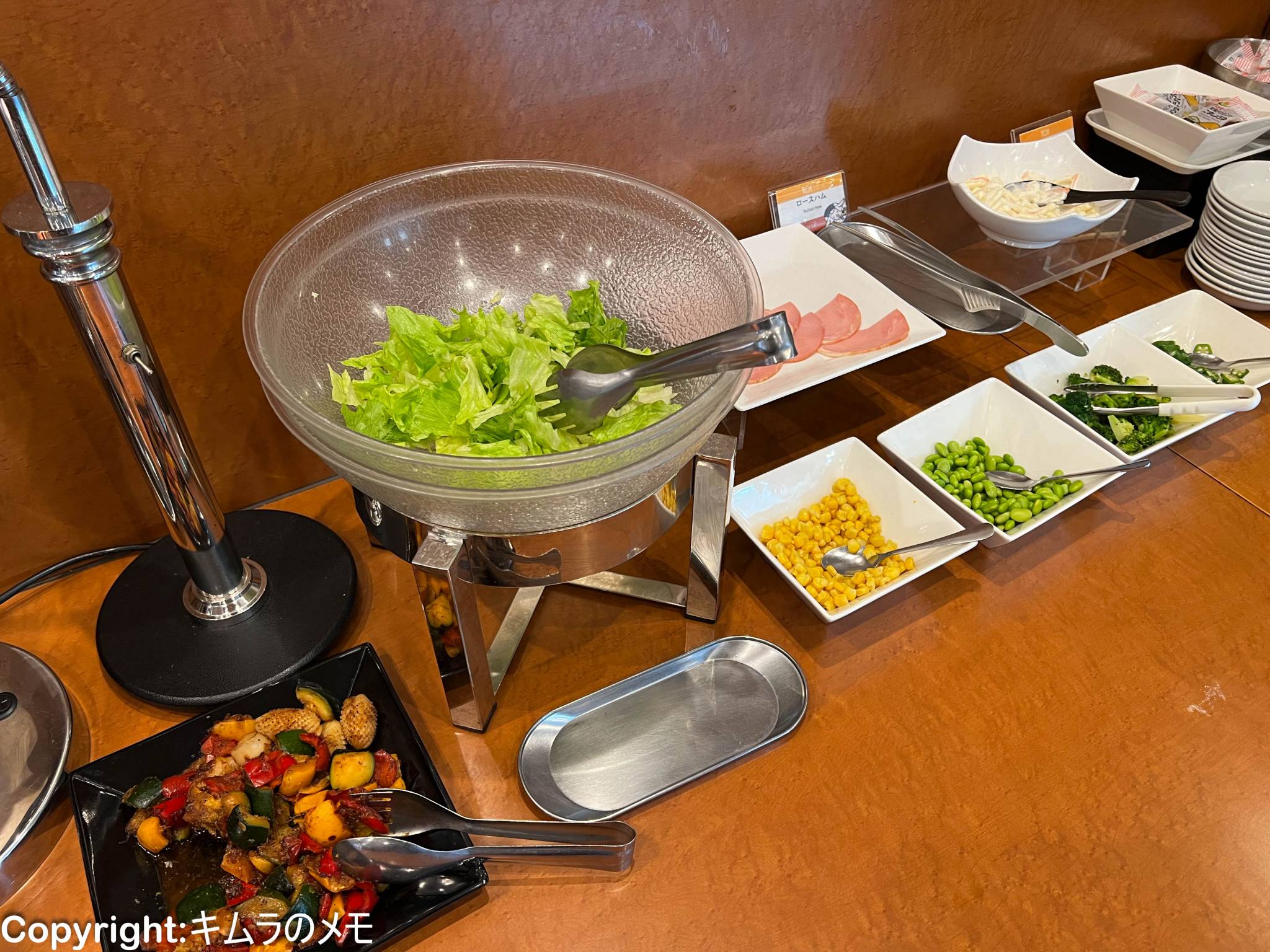 その横のサラダコーナーには葉物の他に何種類かの野菜とハムが用意されている。