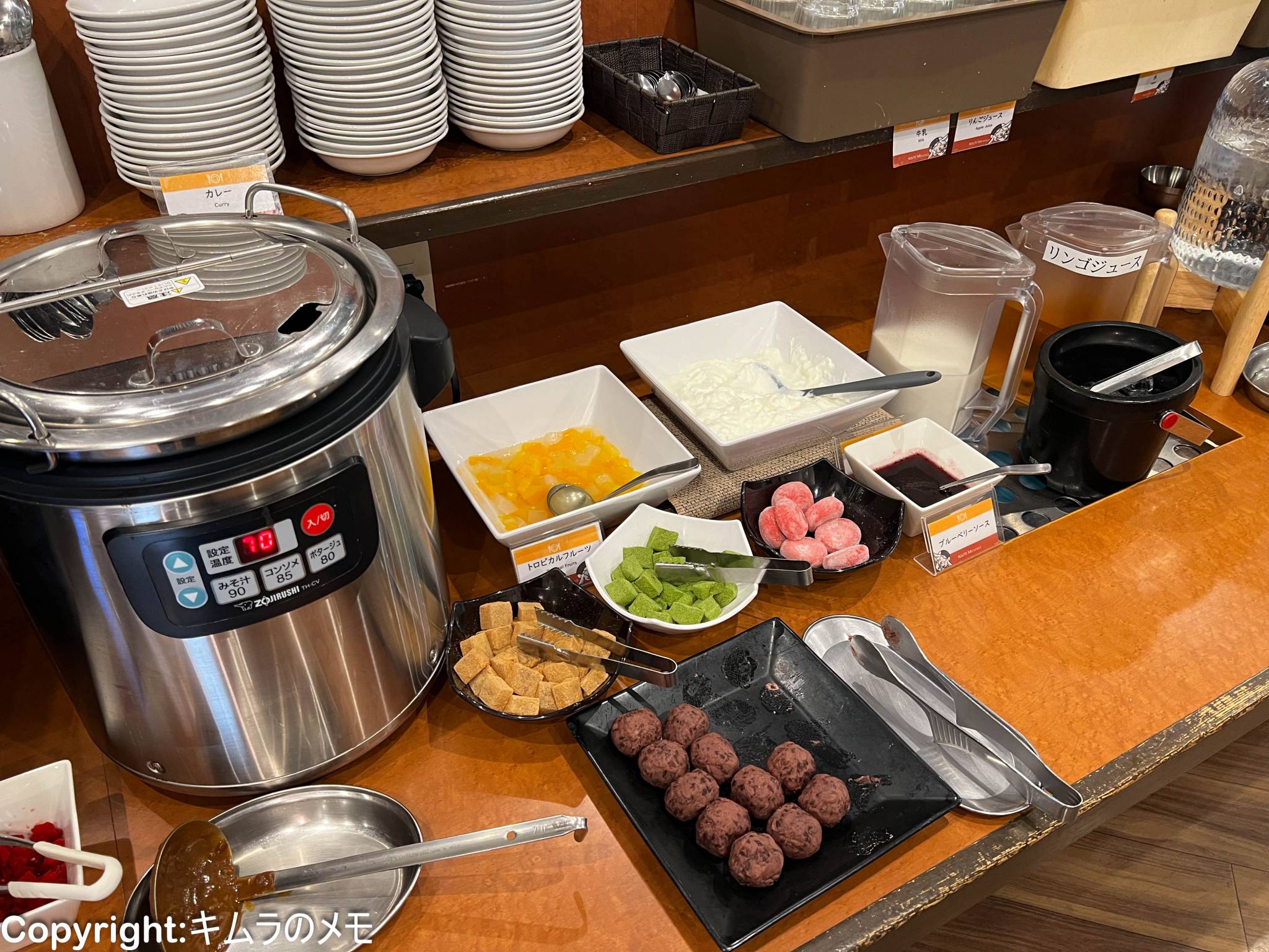 ドリンク類はリンゴジュースや牛乳が用意されており、スイーツにはわらび餅やフルーツ、ヨーグルトなど、比較的種類も豊富。