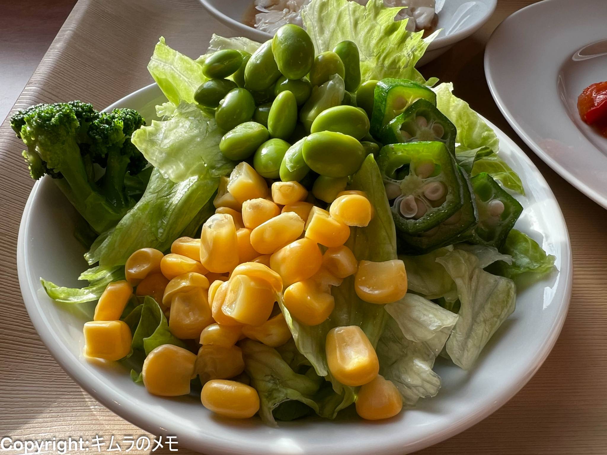 葉物は1種類だけだが、コーンや豆、オクラなどがあるのでそれなりに充実している。