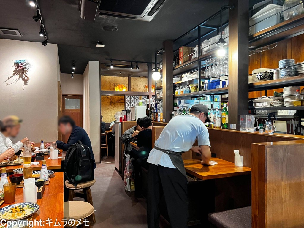 店内はオシャレで少し高級感のある居酒屋という雰囲気になっており、入口側にカウンター席が6席、奥側には2名掛けテーブルが3卓、4名掛けテーブルが2卓、そして奥に10名程度で使えそうな半個室的なスペースがあり、トータルキャパは30席程度。