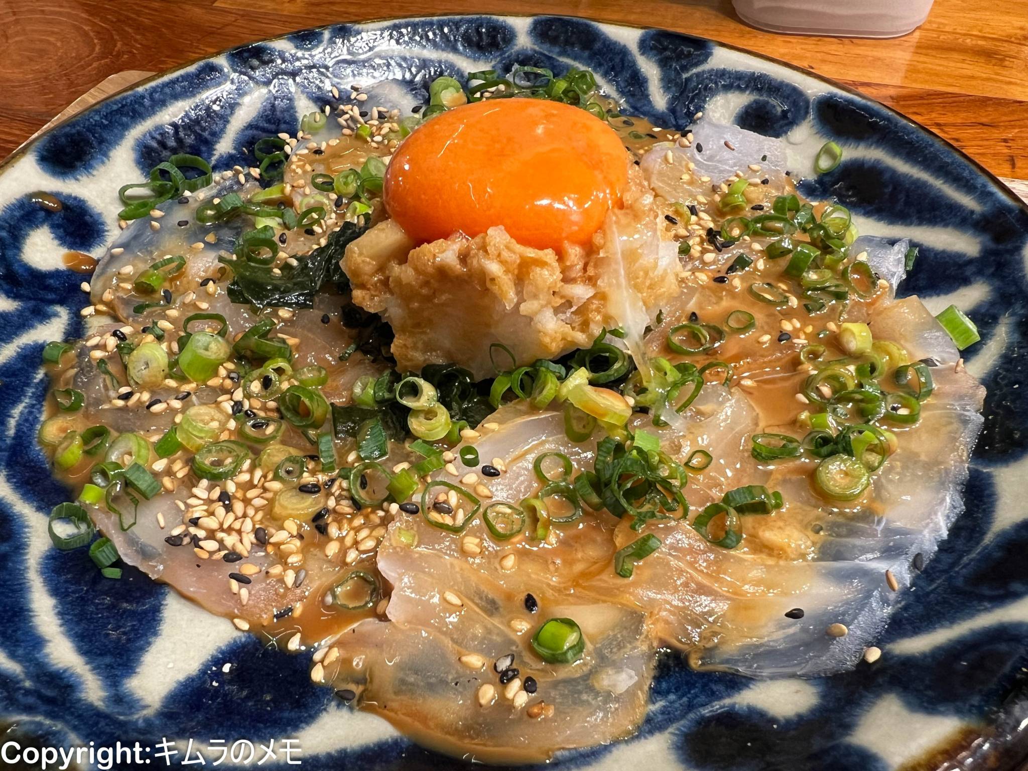通常、ブダイ系の魚は皮を湯引きして、皮を付けた状態でスライスして提供する事が多いのだが、こちらのお店では敢えて薄くカルパッチョ的にスライスして皮も除いた状態での提供。