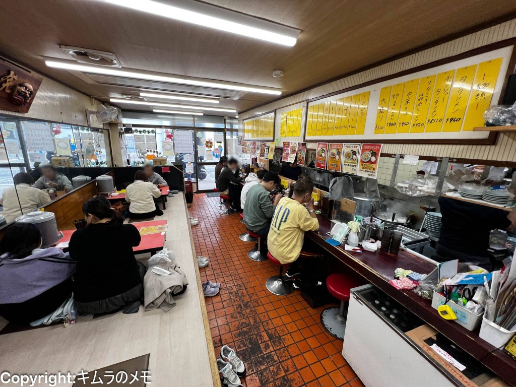店内は油の香りが立ち込める町中華の雰囲気で小上がりエリアとカウンター席エリアに分かれており、カウンター席は6席、小上がりは4名卓が4卓の計20名程度のキャパ。