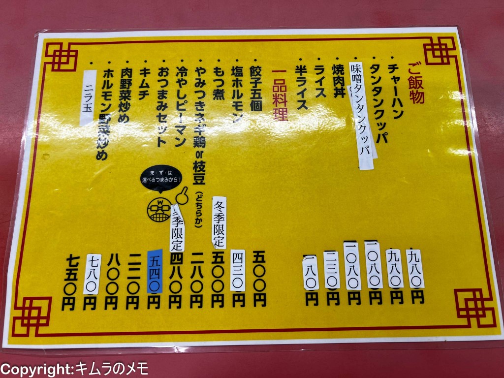 また、ご飯ものは定番のチャーハンの他にもタンタンクッパなどの辛めのメニューであったり、ビールが進むもつ煮やモルモン野菜炒めなど、ラーメンだけでなく一杯飲めるようなメニューが多く用意されている。