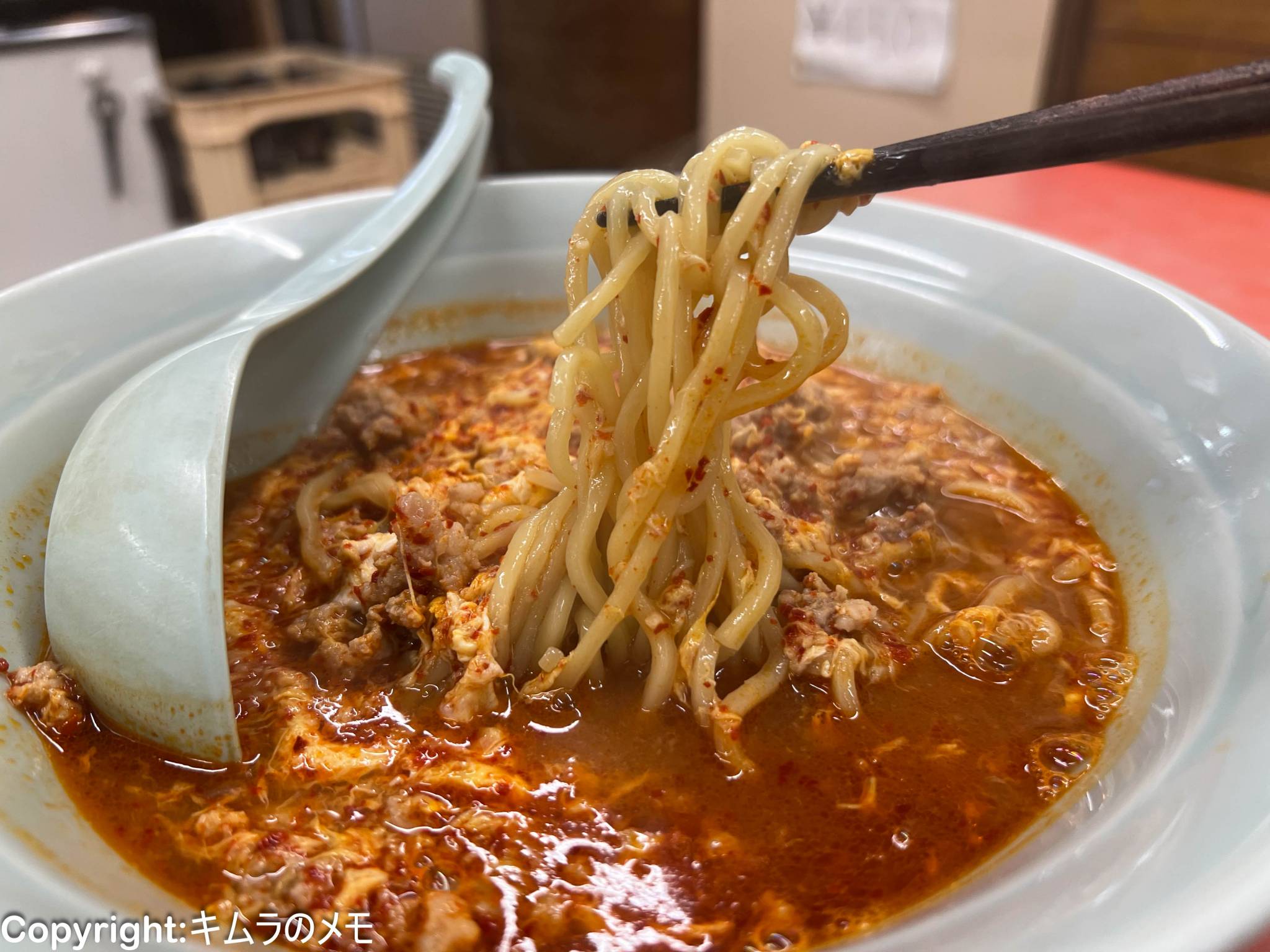 今回は初訪問ということで素直に「タンタンメン」をオーダーしたが、ニュータンタンタイプなので普通に想像する担々麵とは全くビジュアルは異なり、真っ赤なスープの上には溶き卵と挽肉が乗せられたのもの。