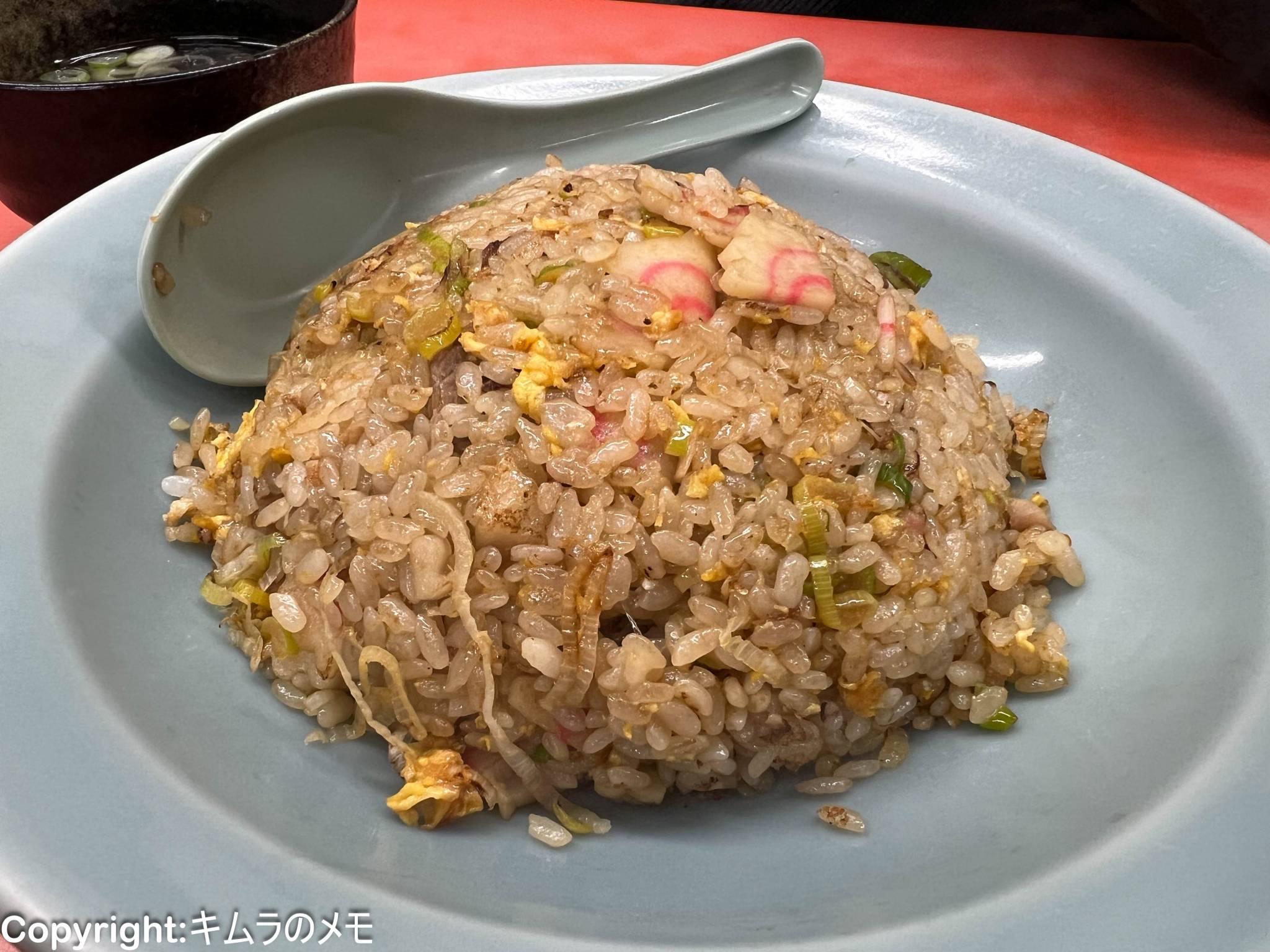 具はカマボコ、チャーシュー、玉子、ネギとシンプルで、食感はパラパラではなくどちらかというとしっとりとしたもの。