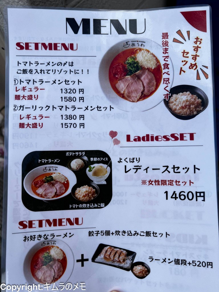 トマトラーメンは辛味やニンニクなど派生系メニューがあり、それぞれ大盛りも用意されている。