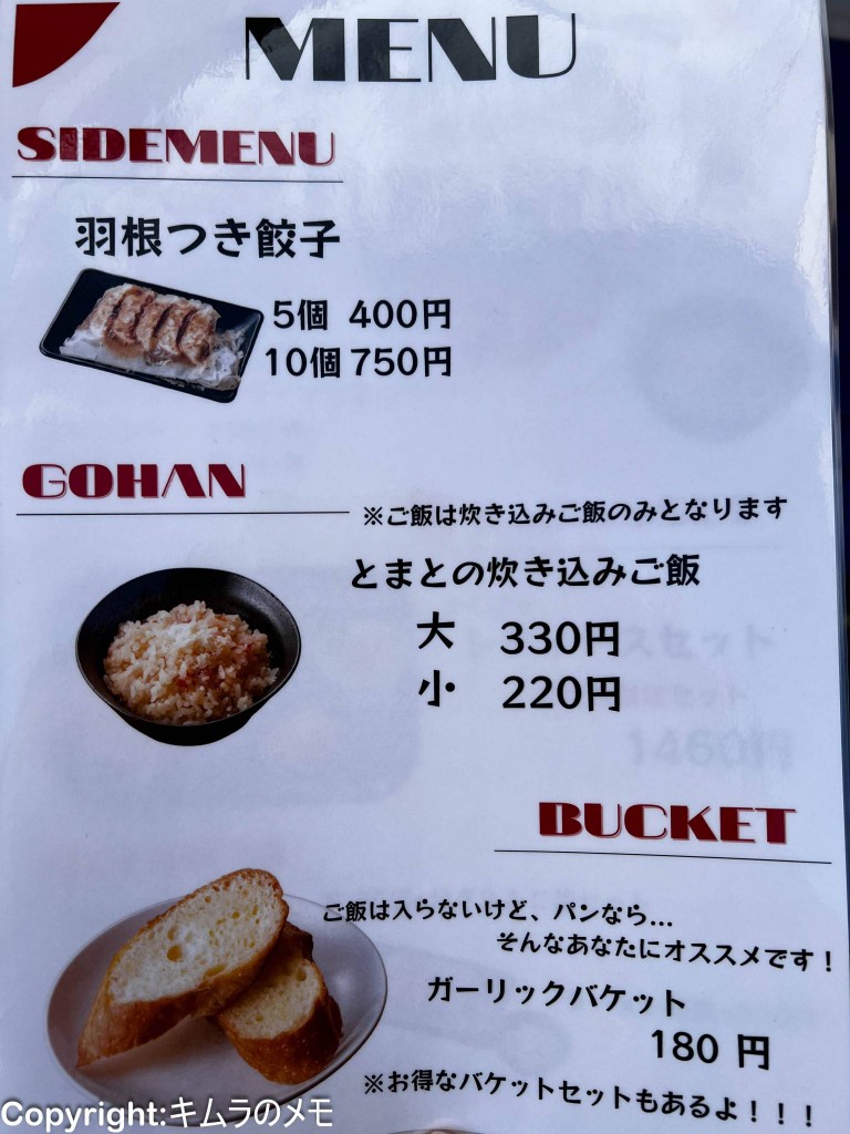 再度メニューとしてはラーメン店定番の餃子に加え、ライスの代わりに「とまとの炊き込みご飯」と「バゲット」という不思議なメニューが用意されている。