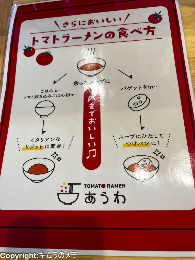 テーブルには「さらにおいしいトマトラーメンの食べ方」としてPOPが置いてある。