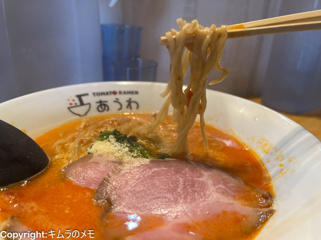 トンコツスープがトマトの旨味を残しながら酸味だけをバランスよく抑え、そこにスープの中に入っている細かく輪切りにされたソーセージの旨味が加わり濃厚な味わいになる。