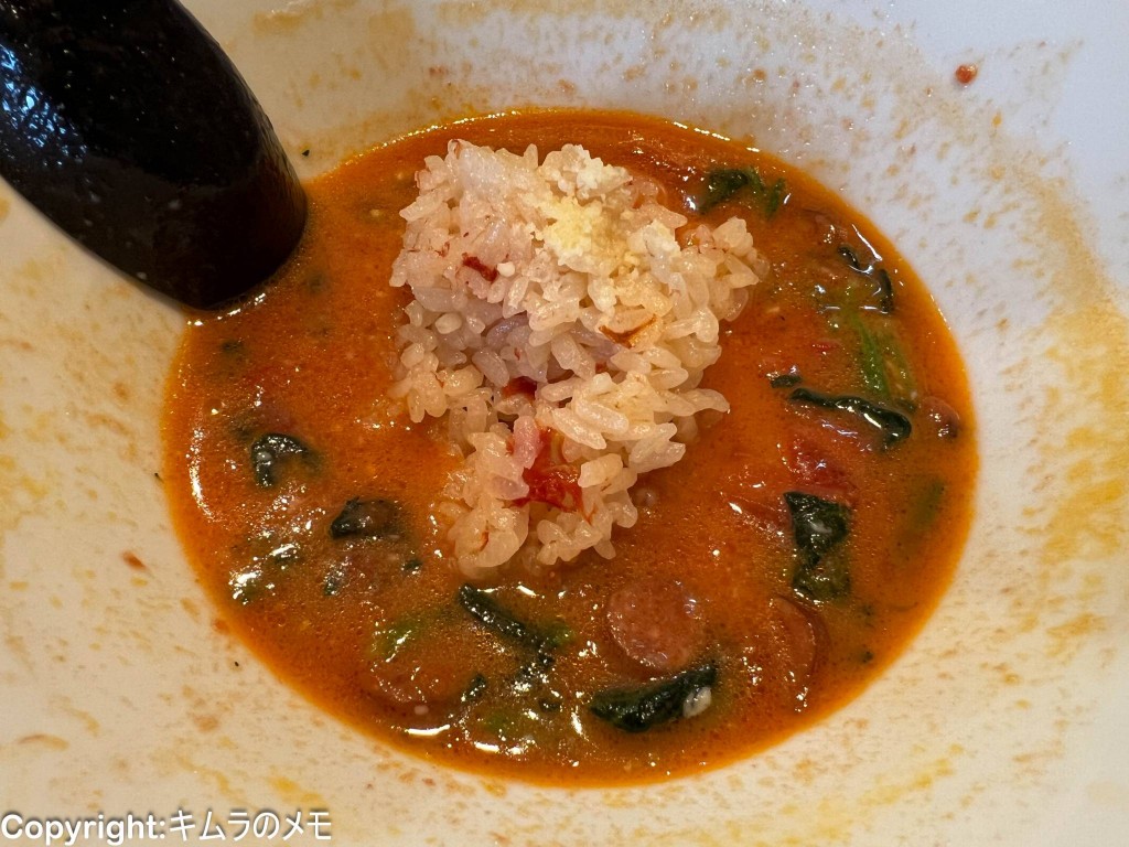 メインのトマトラーメンは締めにご飯をダイブさせるリゾット方式がオススメ。