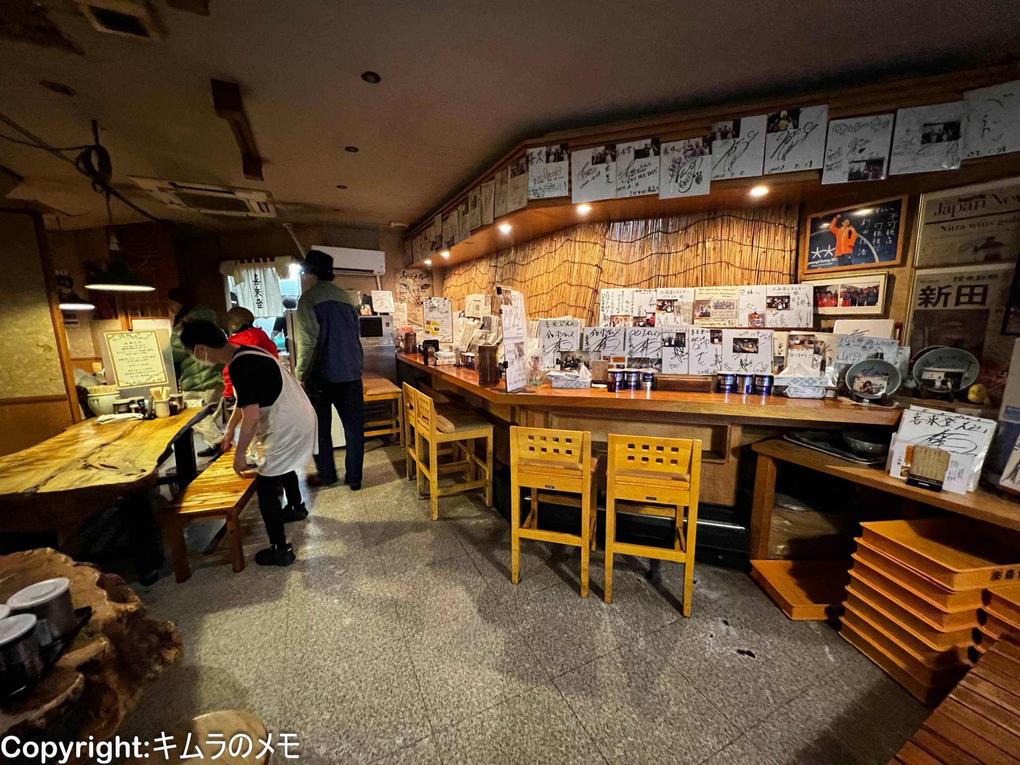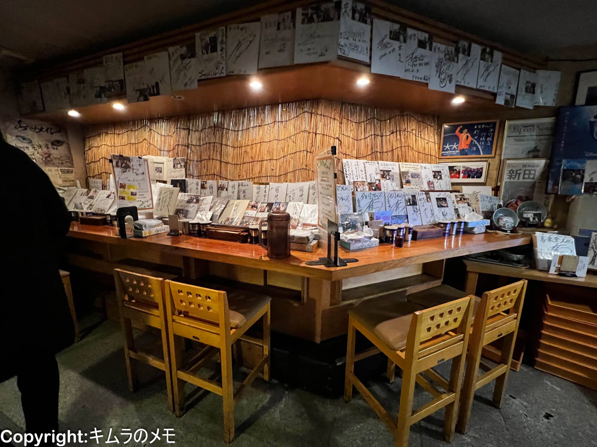 カウンター席側には有名人のサインが大量に並べられており、らーめん提供までの間じっくりと眺めていられる。