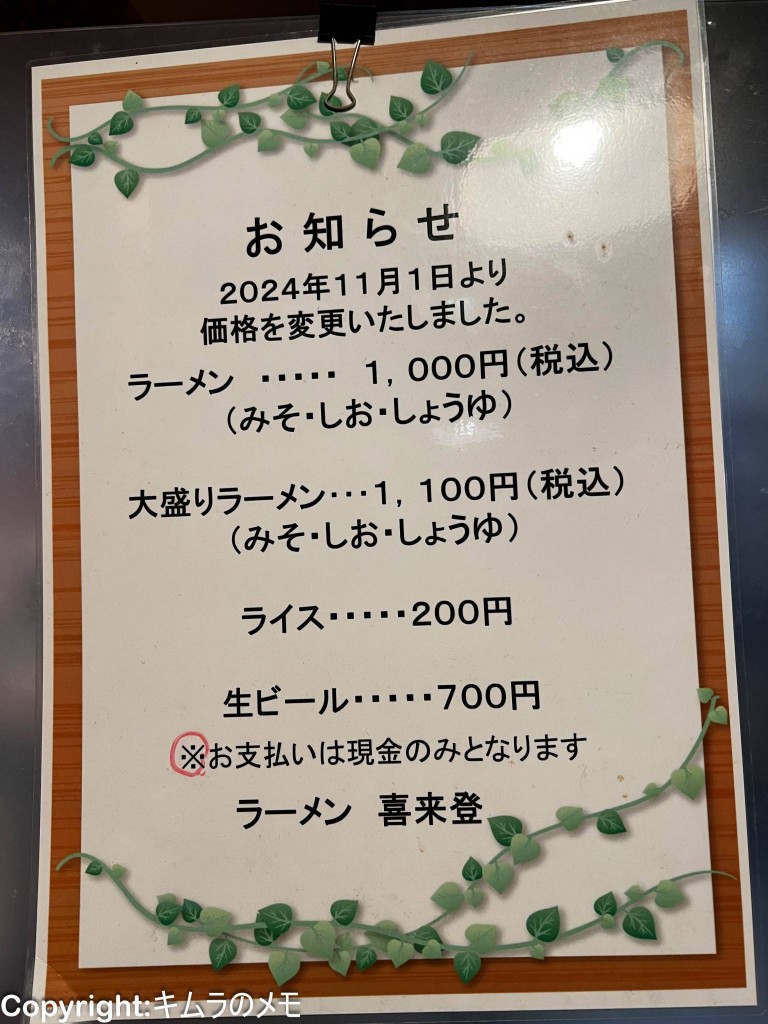 ラーメンもしくは大盛りラーメンの2種類のみで、サイドメニューにはライスの1種類のみ。