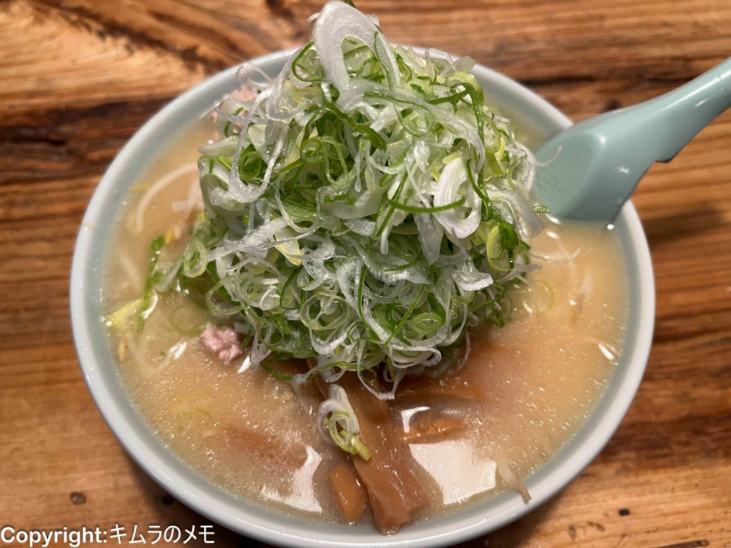 そのビジュアルは二郎で野菜マシマシをコールしたような高さで、刻みたてのネギはほんのりとした辛味があり、スープに絡ませながら頂くと味変としても楽しめる。