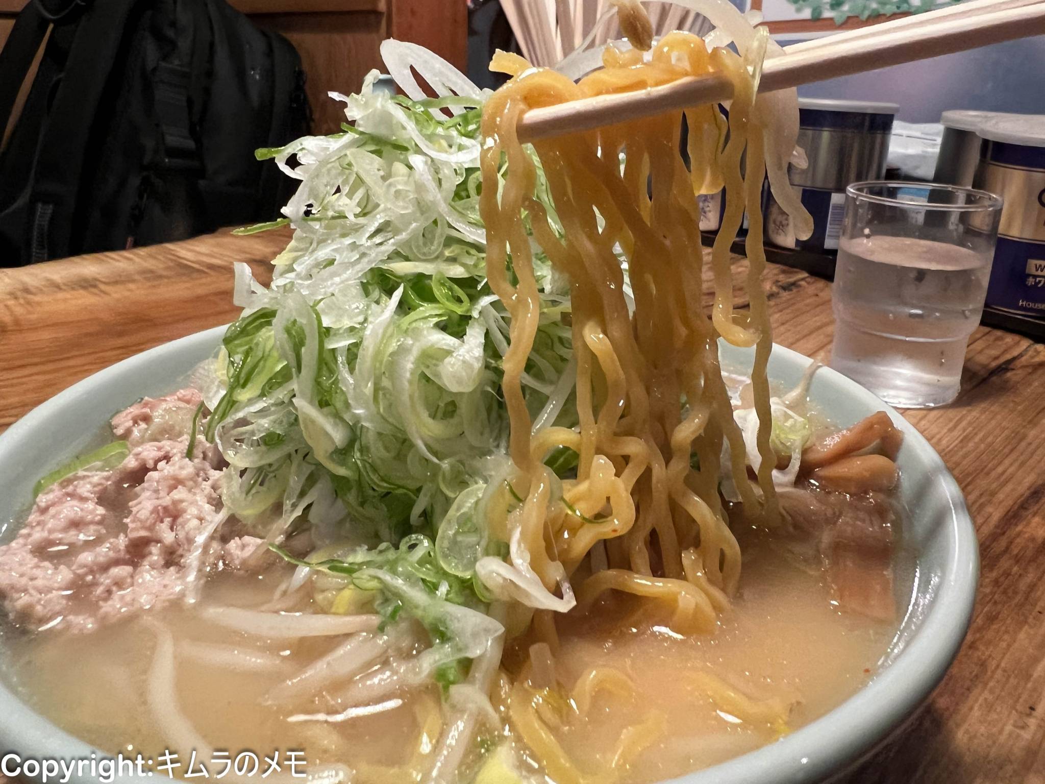 個人的には好みの麺で、爆盛りのネギ効果もあってか、ボリューム感も結構ある。